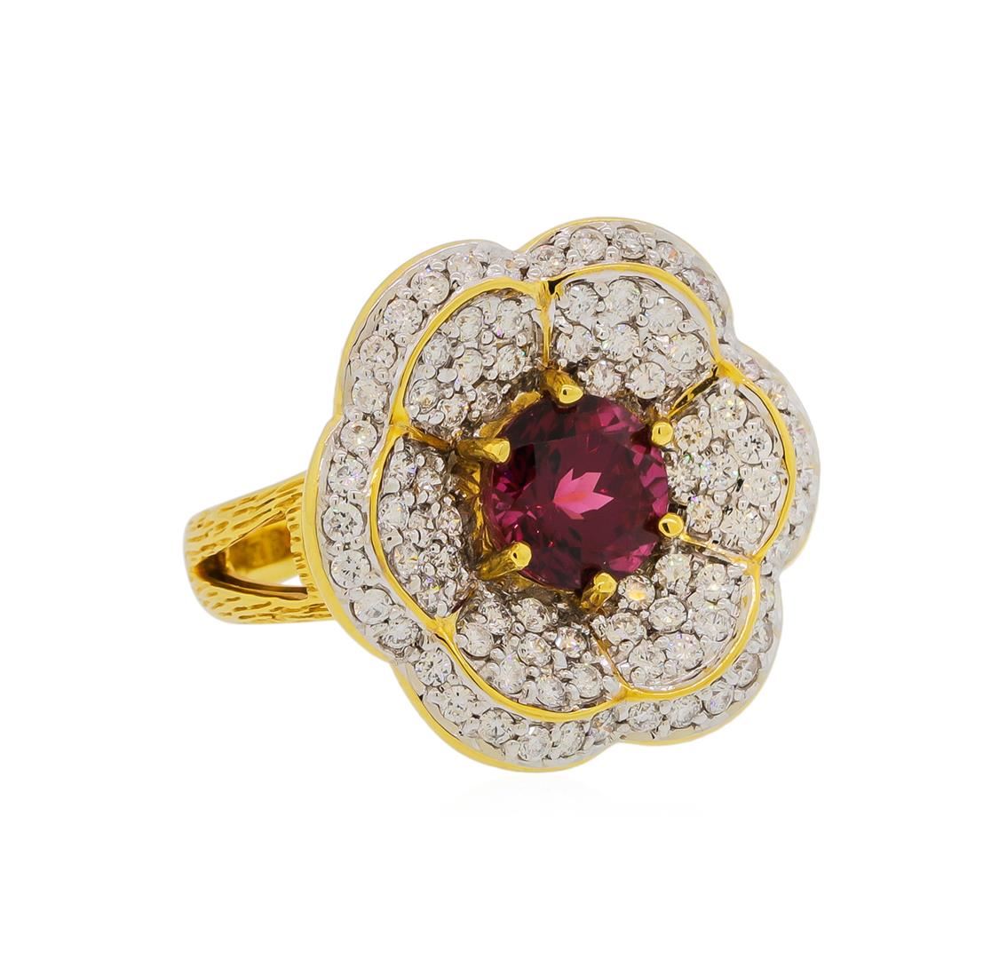 One electronically tested 18KT yellow gold lady's combination cast & assembled fashion floral design ring with a bright polish finish. The featured lady's ring has a shank measuring 2.80 millimeters wide. Identified with markings of '18K'. Condition is new, good workmanship. Containing: One prong set round modified brilliant cut natural red spinel, measuring 8.05 - 7.95 x 5.88 mm, (depth est.) approximate weight of 2.55ct., clarity is eye clean, medium dark, moderately strong, orangy red color, (GIA oR 6/4), cut is very good. Transmitting light with no distortion, transparent. Colored gemstones are presumed to have been subjected to commonly used enhancement processes. Graded in the setting. Eighty-Four prong set round brilliant cut diamonds, measuring 1.60 - 1.50 x 0.96mm (depth est.) approximate total weight of 84 Stones = 1.19ct. Graded in the setting. Clarity SI-1 to SI-2. Color: G - H Cut Good. Total Weight of Colored Stones 2.55ct.. Total Weight of Diamonds 1.19ct.. Total Weight of Ring 11.60gm. GAS Appraised at $11,760.00.