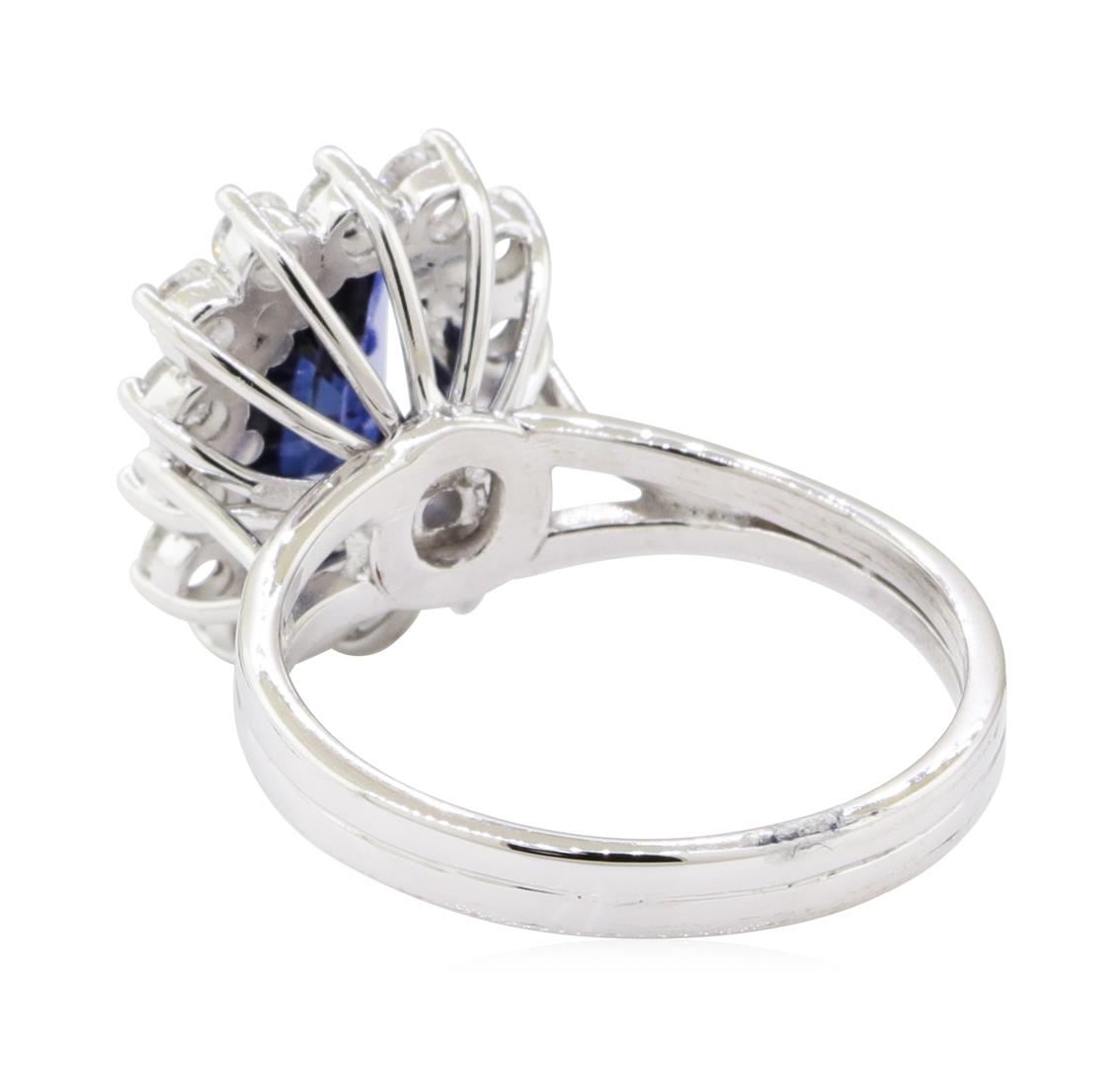 One electronically tested 14KT white gold lady's cast fashion ring with a wire basket halo with a bright polish finish. The featured lady's ring has a double shank measuring 2.60 millimeters wide. Identified with markings of '14K'. Condition is new, good workmanship. Containing: One prong set rectangular cushion modified mixed cut natural blue sapphire, measuring 8.36 x 5.62 x 3.95mm, (depth est.) 5%. bulge factor, approximate weight of 1.85ct., clarity is eye clean, medium dark, strong, very slightly greenish blue color, (GIA vslgB 6/5), cut is good. Transmitting light with no distortion, transparent. Colored gemstones are presumed to have been subjected to commonly used enhancement processes. Graded in the setting. Fourteen prong set round brilliant cut diamonds, measuring 2.40 - 2.30 x 1.46mm (depth est.) approximate total weight of 14 Stones = 0.70ct. Graded in the setting. Color G - H Clarity VS-1 to VS-2 Cut Very Good. Total Weight of Colored Stones 1.85ct.. Total Weight of Diamonds 0.70ct.. Total Weight of Ring 4.80gm GAS Appraised at $6685.00. GAS Appraised at $6,685.00.