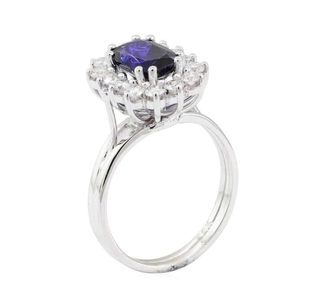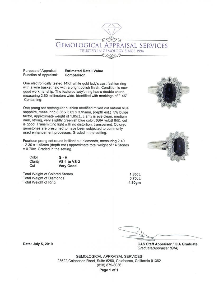 One electronically tested 14KT white gold lady's cast fashion ring with a wire basket halo with a bright polish finish. The featured lady's ring has a double shank measuring 2.60 millimeters wide. Identified with markings of '14K'. Condition is new, good workmanship. Containing: One prong set rectangular cushion modified mixed cut natural blue sapphire, measuring 8.36 x 5.62 x 3.95mm, (depth est.) 5%. bulge factor, approximate weight of 1.85ct., clarity is eye clean, medium dark, strong, very slightly greenish blue color, (GIA vslgB 6/5), cut is good. Transmitting light with no distortion, transparent. Colored gemstones are presumed to have been subjected to commonly used enhancement processes. Graded in the setting. Fourteen prong set round brilliant cut diamonds, measuring 2.40 - 2.30 x 1.46mm (depth est.) approximate total weight of 14 Stones = 0.70ct. Graded in the setting. Color G - H Clarity VS-1 to VS-2 Cut Very Good. Total Weight of Colored Stones 1.85ct.. Total Weight of Diamonds 0.70ct.. Total Weight of Ring 4.80gm GAS Appraised at $6685.00. GAS Appraised at $6,685.00.