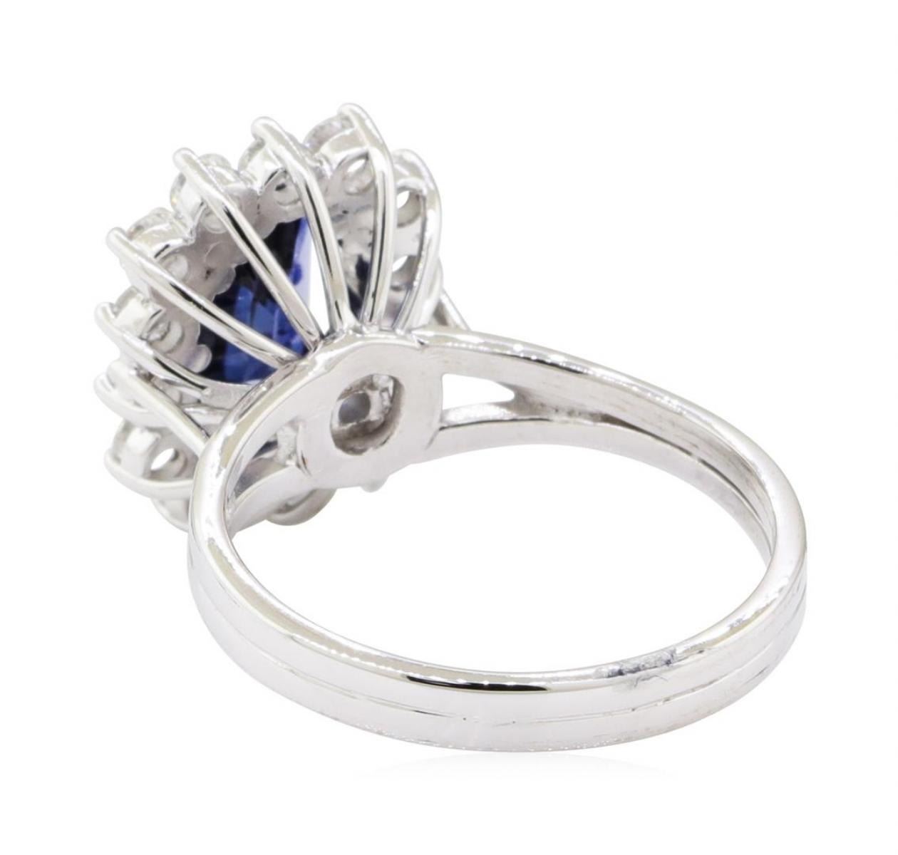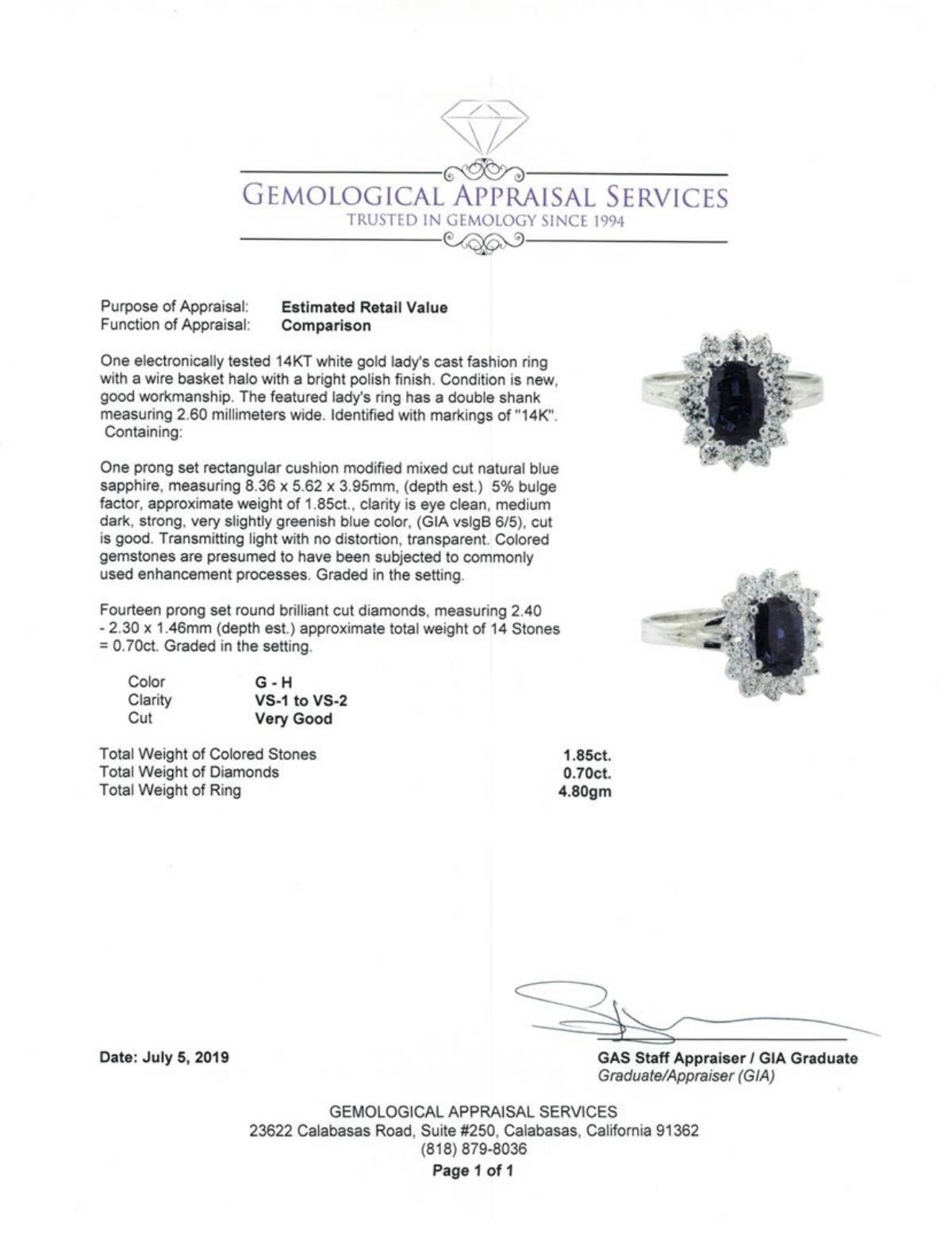 One electronically tested 14KT white gold lady's cast fashion ring with a wire basket halo with a bright polish finish. The featured lady's ring has a double shank measuring 2.60 millimeters wide. Identified with markings of '14K'. Condition is new, good workmanship. Containing: One prong set rectangular cushion modified mixed cut natural blue sapphire, measuring 8.36 x 5.62 x 3.95mm, (depth est.) 5%. bulge factor, approximate weight of 1.85ct., clarity is eye clean, medium dark, strong, very slightly greenish blue color, (GIA vslgB 6/5), cut is good. Transmitting light with no distortion, transparent. Colored gemstones are presumed to have been subjected to commonly used enhancement processes. Graded in the setting. Fourteen prong set round brilliant cut diamonds, measuring 2.40 - 2.30 x 1.46mm (depth est.) approximate total weight of 14 Stones = 0.70 ct. Graded in the setting. Color G - H Clarity VS-1 to VS-2 Cut Very Good. Total Weight of Colored Stones 1.85ct.. Total Weight of Diamonds 0.70 ct.. Total Weight of Ring 4.80gm GAS Appraised at $6685.00. GAS Appraised.