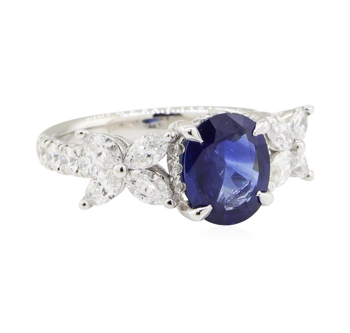 One electronically tested platinum lady's cast fashion ring with a bright polish finish. The featured lady's ring has shoulders set with marquise starbursts and a shank measuring 2.40 millimeters wide. Identified with markings of 'PLAT'. Condition is new, good workmanship. Containing: One prong set oval modified mixed cut natural blue sapphire, measuring 8.47 x 6.78 x 3.32mm, (depth est.) approximate weight of 1.61ct., clarity is slightly included, medium dark, moderately strong, blue color, (GIA B 6/4), cut is very good. Transmitting light with a minimum of distortion, transparent. Colored gemstones are presumed to have been subjected to commonly used enhancement processes. Graded in the setting. Eight prong set marquise shaped cut diamonds, measuring 3.90 x 2.10 x 1.33mm (depth est.) approximate total weight of 8 Stones = 0.50ct. Graded in the setting. Color G - H Clarity VS-2 to SI-1 Cut Very Good Eight prong set round brilliant cut diamonds, measuring 2.15 - 2.10 x 1.32mm (depth est.) approximate total weight of 8 Stones = 0.30ct. Graded in the setting. Color F - G Clarity VS-1 to VS-2 Cut Excellent Fourteen prong set round brilliant cut diamonds, measuring 1.40 - 1.35 x 0.86mm (depth est.) approximate total weight of 14 Stones = 0.14ct. Graded in the setting. Color G - H Clarity VS-2 to SI-1 Cut Very Good. Total Weight of Colored Stones 1.61ct.. Total Weight of Diamonds 0.94ct.. Total Weight of Ring 5.30gm GAS Appraised at $6910.00. GAS Appraised at $6,910.00.