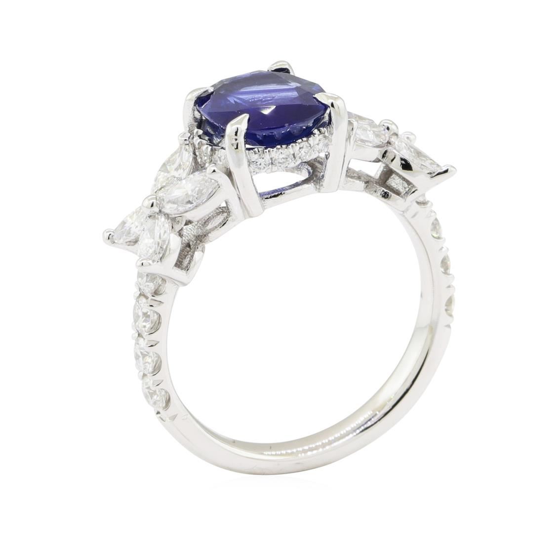 One electronically tested platinum lady's cast fashion ring with a bright polish finish. The featured lady's ring has shoulders set with marquise starbursts and a shank measuring 2.40 millimeters wide. Identified with markings of 'PLAT'. Condition is new, good workmanship. Containing: One prong set oval modified mixed cut natural blue sapphire, measuring 8.47 x 6.78 x 3.32mm, (depth est.) approximate weight of 1.61ct., clarity is slightly included, medium dark, moderately strong, blue color, (GIA B 6/4), cut is very good. Transmitting light with a minimum of distortion, transparent. Colored gemstones are presumed to have been subjected to commonly used enhancement processes. Graded in the setting. Eight prong set marquise shaped cut diamonds, measuring 3.90 x 2.10 x 1.33mm (depth est.) approximate total weight of 8 Stones = 0.50ct. Graded in the setting. Color G - H Clarity VS-2 to SI-1 Cut Very Good Eight prong set round brilliant cut diamonds, measuring 2.15 - 2.10 x 1.32mm (depth est.) approximate total weight of 8 Stones = 0.30ct. Graded in the setting. Color F - G Clarity VS-1 to VS-2 Cut Excellent Fourteen prong set round brilliant cut diamonds, measuring 1.40 - 1.35 x 0.86mm (depth est.) approximate total weight of 14 Stones = 0.14ct. Graded in the setting. Color G - H Clarity VS-2 to SI-1 Cut Very Good. Total Weight of Colored Stones 1.61ct.. Total Weight of Diamonds 0.94ct.. Total Weight of Ring 5.30gm GAS Appraised at $6910.00. GAS Appraised at $6,910.00.