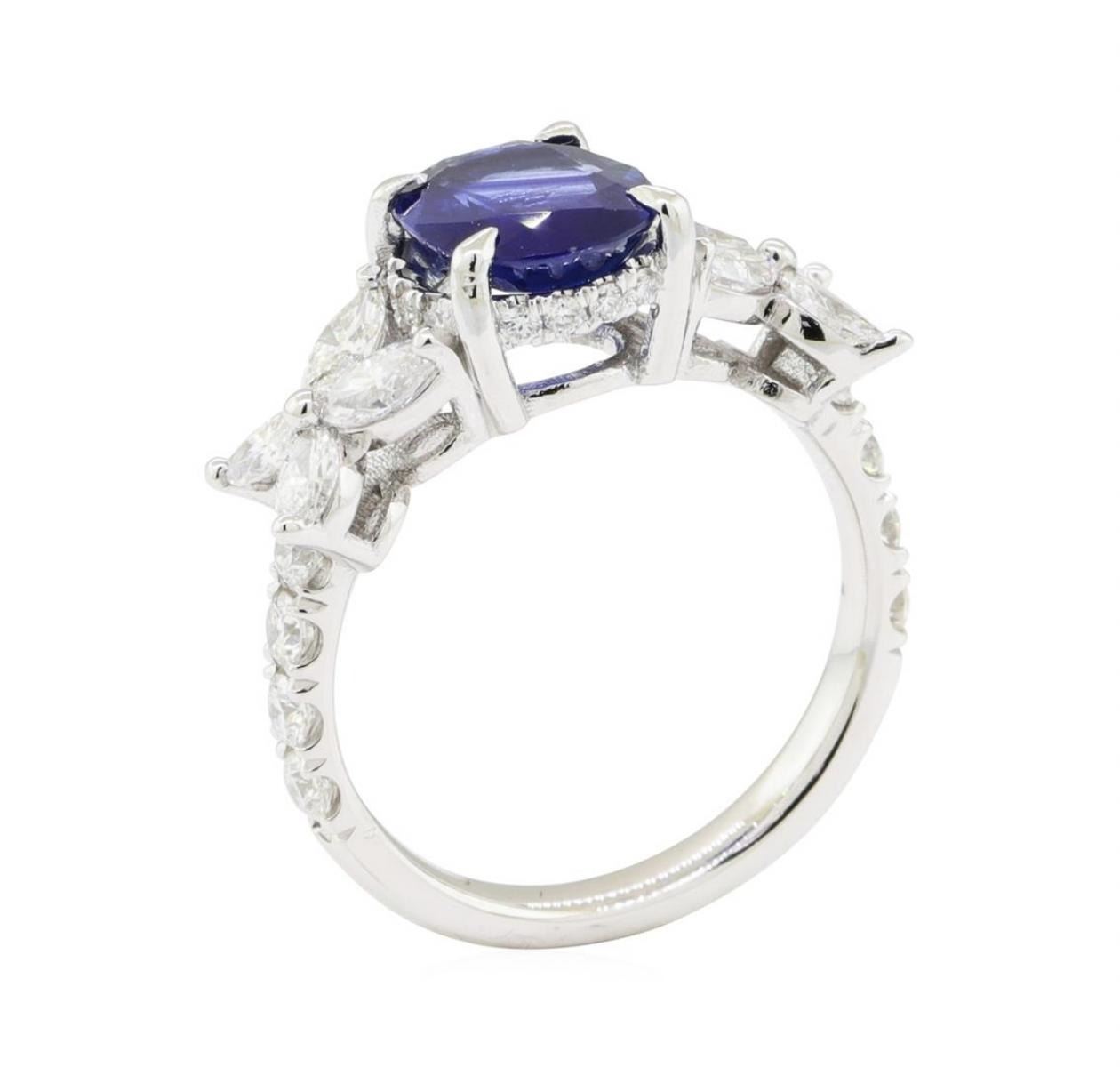One electronically tested platinum lady's cast fashion ring with a bright polish finish. The featured lady's ring has shoulders set with marquise starbursts and a shank measuring 2.40 millimeters wide. Identified with markings of 'PLAT'. Condition is new, good workmanship. Containing: One prong set oval modified mixed cut natural blue sapphire, measuring 8.47 x 6.78 x 3.32mm, (depth est.) approximate weight of 1.61ct., clarity is slightly included, medium dark, moderately strong, blue color, (GIA B 6/4), cut is very good. Transmitting light with a minimum of distortion, transparent. Colored gemstones are presumed to have been subjected to commonly used enhancement processes. Graded in the setting. Eight prong set marquise shaped cut diamonds, measuring 3.90 x 2.10 x 1.33mm (depth est.) approximate total weight of 8 Stones = 0.50 ct. Graded in the setting. Color G - H Clarity VS-2 to SI-1 Cut Very Good Eight prong set round brilliant cut diamonds, measuring 2.15 - 2.10 x 1.32mm (depth est.) approximate total weight of 8 Stones = 0.30 ct. Graded in the setting. Color F - G Clarity VS-1 to VS-2 Cut Excellent Fourteen prong set round brilliant cut diamonds, measuring 1.40 - 1.35 x 0.86mm (depth est.) approximate total weight of 14 Stones = 0.14ct. Graded in the setting. Color G - H Clarity VS-2 to SI-1 Cut Very Good. Total Weight of Colored Stones 1.61ct.. Total Weight of Diamonds 0.94ct.. Total Weight of Ring 5.30gm GAS Appraised at $6910.00. GAS Appraised.