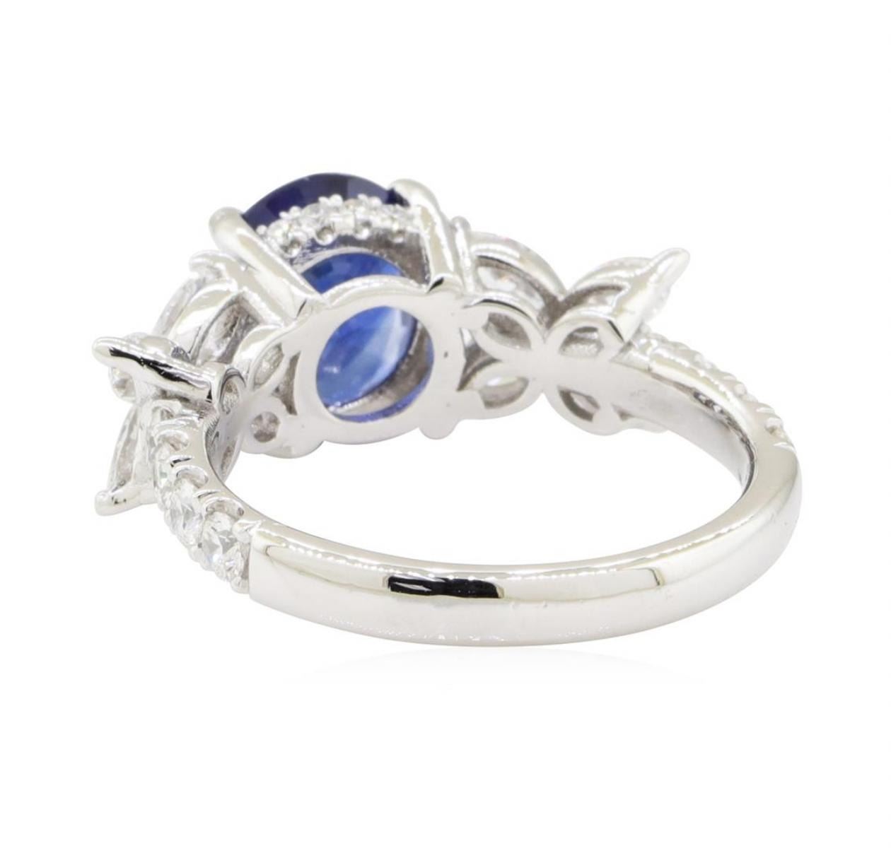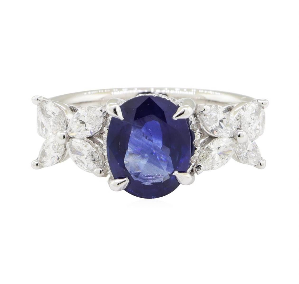 One electronically tested platinum lady's cast fashion ring with a bright polish finish. The featured lady's ring has shoulders set with marquise starbursts and a shank measuring 2.40 millimeters wide. Identified with markings of 'PLAT'. Condition is new, good workmanship. Containing: One prong set oval modified mixed cut natural blue sapphire, measuring 8.47 x 6.78 x 3.32mm, (depth est.) approximate weight of 1.61ct., clarity is slightly included, medium dark, moderately strong, blue color, (GIA B 6/4), cut is very good. Transmitting light with a minimum of distortion, transparent. Colored gemstones are presumed to have been subjected to commonly used enhancement processes. Graded in the setting. Eight prong set marquise shaped cut diamonds, measuring 3.90 x 2.10 x 1.33mm (depth est.) approximate total weight of 8 Stones = 0.50 ct. Graded in the setting. Color G - H Clarity VS-2 to SI-1 Cut Very Good Eight prong set round brilliant cut diamonds, measuring 2.15 - 2.10 x 1.32mm (depth est.) approximate total weight of 8 Stones = 0.30 ct. Graded in the setting. Color F - G Clarity VS-1 to VS-2 Cut Excellent Fourteen prong set round brilliant cut diamonds, measuring 1.40 - 1.35 x 0.86mm (depth est.) approximate total weight of 14 Stones = 0.14ct. Graded in the setting. Color G - H Clarity VS-2 to SI-1 Cut Very Good. Total Weight of Colored Stones 1.61ct.. Total Weight of Diamonds 0.94ct.. Total Weight of Ring 5.30gm GAS Appraised at $6910.00. GAS Appraised.
