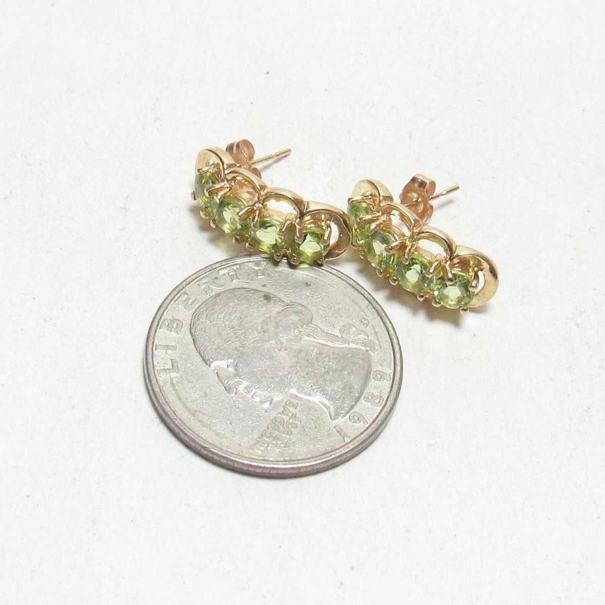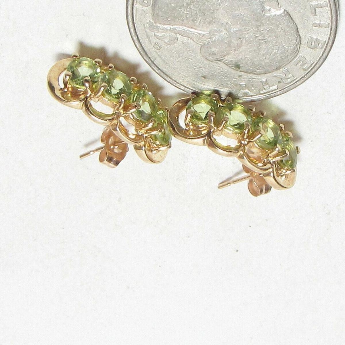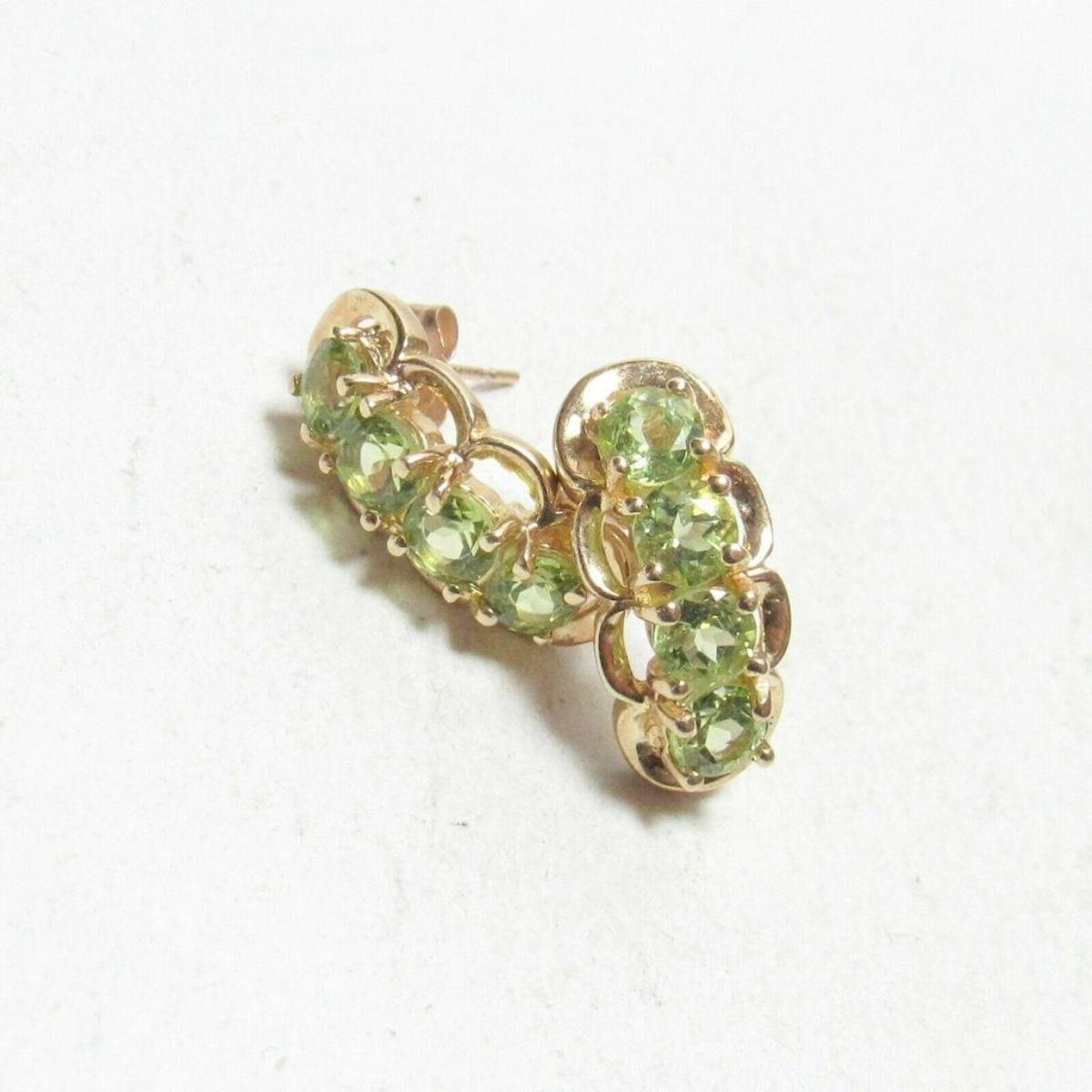 2.55cts Natural round green peridot gemstones ( 8 total ) set into 10kt yellow gold drop type earrings with butterfly fastenings. Â 3/8" X 3/4".