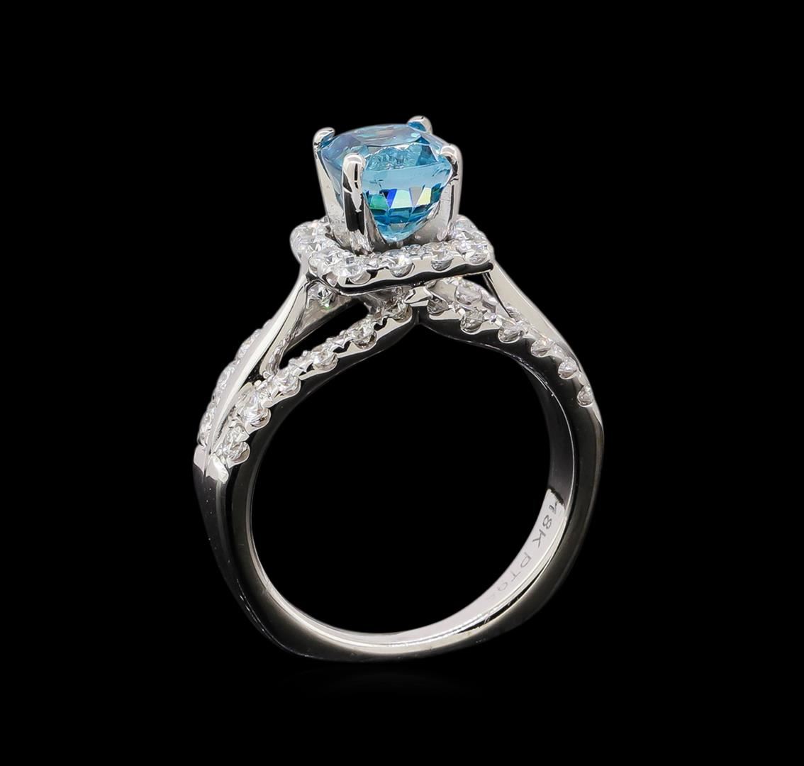 One electronically tested Platinum & 18KT white gold ladies cast & assembled blue zircon and diamond ring with a bright polish finish. The featured blue zircon is set within a diamond bezel supported by diamond set three-way split shoulders, completed by a two millimeter wide gold band. Identified with markings of '18K PT950'. Condition is new, good workmanship. Containing: One platinum prong set rectangular cushion mixed cut natural blue zircon, measuring 7.00 x 6.00 x 5.00mm, 10%. bulge factor, approximate weight of 2.56ct., clarity is eye clean, type I, medium, very slightly grayish, very strongly greenish blue color, (GIA vstgB 5/3), cut is good. Transmitting light with no distortion, transparent. Graded in the setting. Thirty-Six prong set round brilliant cut diamonds, measuring 2.00 - 1.90 x 1.17mm (depth est.) approximate total weight of 36 Stones = 1.05ct. Graded in the setting. Clarity VS-1 to SI-1. Color: F - H. Total Weight of Colored Stones 2.56ct.. Total Weight of Diamonds 1.05ct.. Total Weight of Ring 6.90gm. AIG Appraised at $6,260.00.