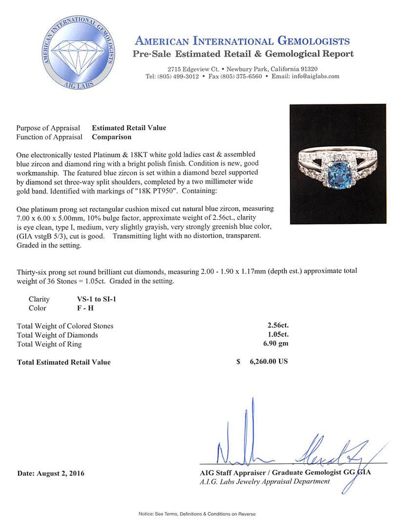 One electronically tested Platinum & 18KT white gold ladies cast & assembled blue zircon and diamond ring with a bright polish finish. The featured blue zircon is set within a diamond bezel supported by diamond set three-way split shoulders, completed by a two millimeter wide gold band. Identified with markings of '18K PT950'. Condition is new, good workmanship. Containing: One platinum prong set rectangular cushion mixed cut natural blue zircon, measuring 7.00 x 6.00 x 5.00mm, 10%. bulge factor, approximate weight of 2.56ct., clarity is eye clean, type I, medium, very slightly grayish, very strongly greenish blue color, (GIA vstgB 5/3), cut is good. Transmitting light with no distortion, transparent. Graded in the setting. Thirty-Six prong set round brilliant cut diamonds, measuring 2.00 - 1.90 x 1.17mm (depth est.) approximate total weight of 36 Stones = 1.05ct. Graded in the setting. Clarity VS-1 to SI-1. Color: F - H. Total Weight of Colored Stones 2.56ct.. Total Weight of Diamonds 1.05ct.. Total Weight of Ring 6.90gm. AIG Appraised at $6,260.00.