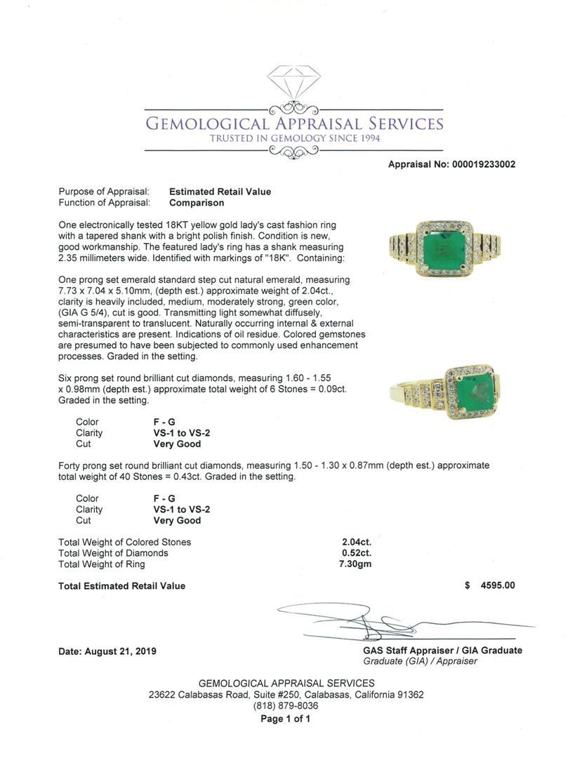 One electronically tested 18KT yellow gold ladys cast fashion ring with a tapered shank with a bright polish finish. Condition is new, good workmanship. The featured lady's ring has a shank measuring 2.35 millimeters wide. Identified with markings of "18K". Containing: One prong set emerald standard step cut naatural emerald, measuring 7.73x7.04x5.10mm, (depth est.) approximate weight of 2.04ct., clarity is heavily included, meduim, moderatly strong, green color, (GIA G 5/4), cut us good. Transmitting light somewhat diffusely, semi-transparent to translucent. Naturally occuring internal & extenal charachteristics are present. Indications of oil residue. Colored gemstones are presumed to have been subjected to commonly used enhancement processes. Graded in the setting. Six prong set round brilliand cut diamonds, measuring 1.60-1.55x0.98mm (depth est.) approximate total weight of 6 stones = 0.09ct. Graded in the setting. Color F-G. Clarity VS-1 to VS-2. Cut Very good. Forty prong set round brilliant cut diamonds, measuring 1.50-1.30x0.87mm (depth est.) approximate total weight of 40 stones = 0.43ct. Graded in the setting. Color F-G. Clarity VS-1 to VS-2. Cut Very good. Total weight of colored stones 2.04ct. Total weight of diamonds 0.52ct. Ttotal weight of ring 7.30gm. Total estimated retail value $4595.00 GAS Appraised.