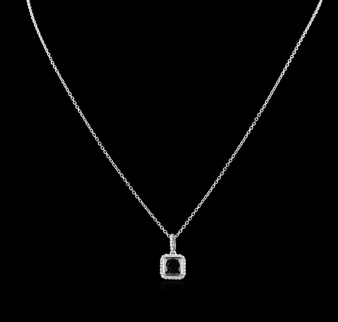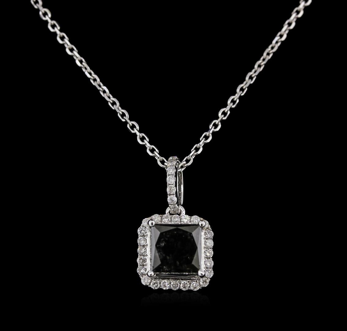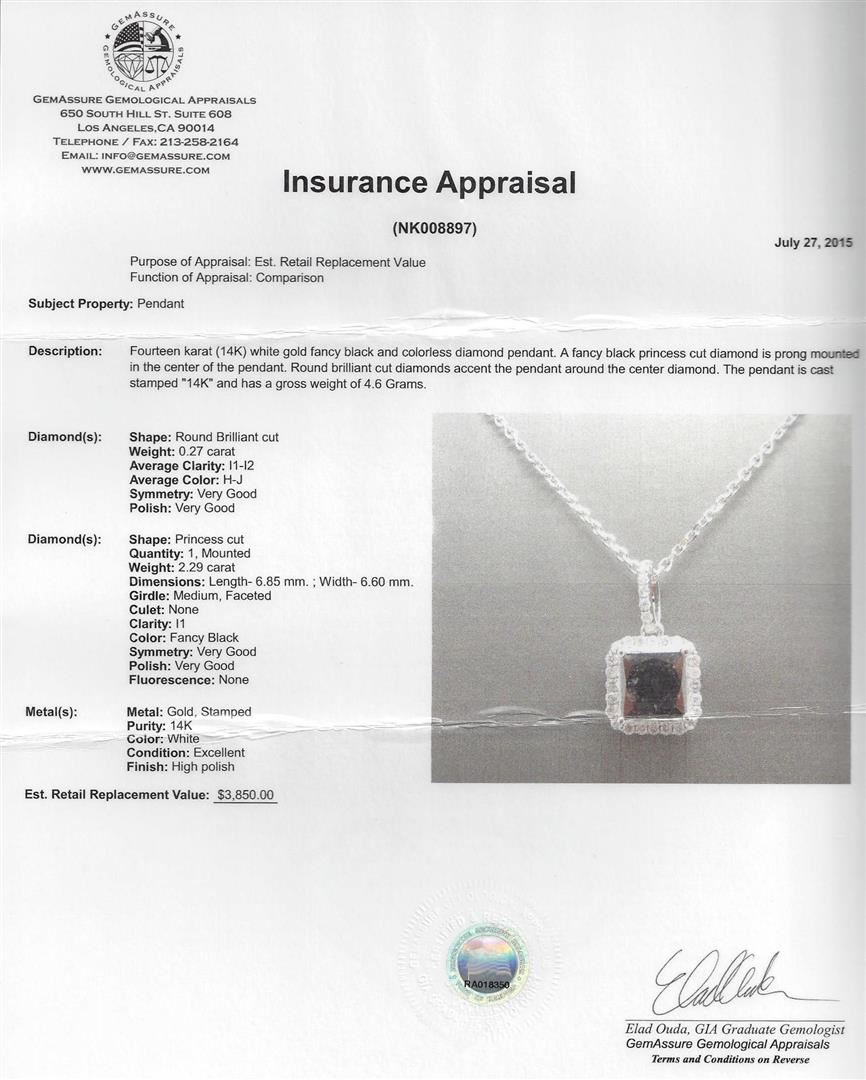 Fourteen karat (14K) white gold fancy black and colorless diamond pendant. A fancy black princess cut diamond is prong mounted in the center of the pendant. Round brilliant cut diamonds accent the pendant around the center diamond. The pendant is cast stamped "14K" and has a gross weight of 4.6 Grams. Diamond(s): Shape: Round Brilliant cut. Weight: 0.27 carat. Average Clarity: I1-I2. Average Color: H-J. Symmetry: Very Good. Polish: Very Good. Diamond(s): Shape: Princess cut. Quantity: 1, Mounted. Weight: 2.29 carat. Dimensions: Length- 6.85 mm. ; Width- 6.60 mm. Girdle: Medium, Faceted. Culet: None. Clarity: I1. Color: Fancy Black. Symmetry: Very Good. Polish: Very Good. Fluorescence: None. Metal(s): Metal: Gold, Stamped. Purity: 14K. Color: White. Condition: Excellent. Finish: High polish. GGA Appraised at $3,850.00.