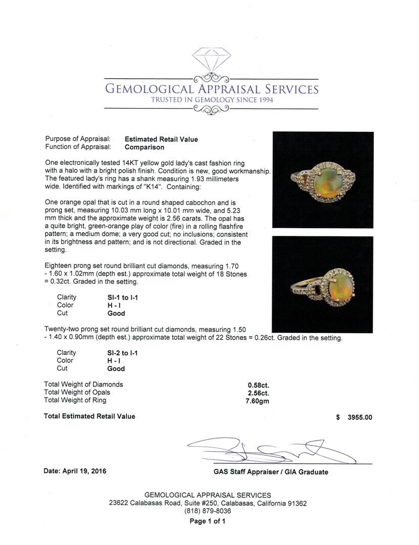 One electronically tested 14KT yellow gold lady's cast fashion ring with a halo with a bright polish finish. The featured lady's ring has a shank measuring 1.93 millimeters wide. Identified with markings of "K14". Condition is new, good workmanship. Containing: One orange opal that is cut in a round shaped cabochon and is prong set, measuring 10.03 mm long x 10.01 mm wide, and 5.23 mm thick and the approximate weight is 2.56 carats. The opal has a quite bright, green-orange play of color (fire) in a rolling flashfire pattern; a medium dome; a very good cut; no inclusions; consistent in its brightness and pattern; and is not directional. Graded in the setting. Eighteen prong set round brilliant cut diamonds, measuring 1.70 - 1.60 x 1.02mm (depth est.) approximate total weight of 18 Stones = 0.32ct. Graded in the setting. Clarity: SI-1 to I-1. Color: H - I. Cut Good Twenty-Two prong set round brilliant cut diamonds, measuring 1.50 - 1.40 x 0.90mm (depth est.) approximate total weight of 22 Stones = 0.26ct. Graded in the setting. Clarity: SI-2 to I-1. Color: H - I. Cut Good. Total Weight of Diamonds 0.58ct. Total Weight of Opals 2.56ct. Total Weight of Ring 7.60gm. GAS Appraised at $3,955.00.
