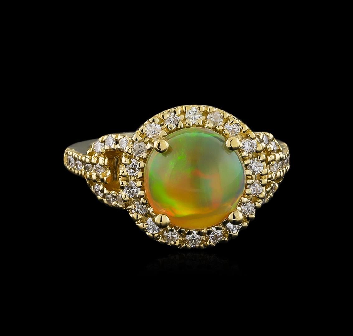 One electronically tested 14KT yellow gold lady's cast fashion ring with a halo with a bright polish finish. The featured lady's ring has a shank measuring 1.93 millimeters wide. Identified with markings of "K14". Condition is new, good workmanship. Containing: One orange opal that is cut in a round shaped cabochon and is prong set, measuring 10.03 mm long x 10.01 mm wide, and 5.23 mm thick and the approximate weight is 2.56 carats. The opal has a quite bright, green-orange play of color (fire) in a rolling flashfire pattern; a medium dome; a very good cut; no inclusions; consistent in its brightness and pattern; and is not directional. Graded in the setting. Eighteen prong set round brilliant cut diamonds, measuring 1.70 - 1.60 x 1.02mm (depth est.) approximate total weight of 18 Stones = 0.32ct. Graded in the setting. Clarity: SI-1 to I-1. Color: H - I. Cut Good Twenty-Two prong set round brilliant cut diamonds, measuring 1.50 - 1.40 x 0.90mm (depth est.) approximate total weight of 22 Stones = 0.26ct. Graded in the setting. Clarity: SI-2 to I-1. Color: H - I. Cut Good. Total Weight of Diamonds 0.58ct. Total Weight of Opals 2.56ct. Total Weight of Ring 7.60gm. GAS Appraised at $3,955.00.