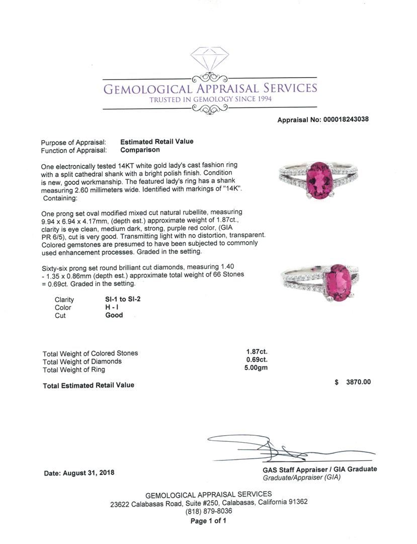 One electronically tested 14KT white gold lady's cast fashion ring with a split cathedral shank with a bright polish finish. The featured lady's ring has a shank measuring 2.60 millimeters wide. Identified with markings of '14K'. Condition is new, good workmanship. Containing: One prong set oval modified mixed cut natural rubellite, measuring 9.94 x 6.94 x 4.17mm, (depth est.) approximate weight of 1.87ct., clarity is eye clean, medium dark, strong, purple red color, (GIA PR 6/5), cut is very good. Transmitting light with no distortion, transparent. Colored gemstones are presumed to have been subjected to commonly used enhancement processes. Graded in the setting. Sixty-Six prong set round brilliant cut diamonds, measuring 1.40 - 1.35 x 0.86mm (depth est.) approximate total weight of 66 Stones = 0.69ct. Graded in the setting. Color H - I Clarity SI-1 to SI-2 Cut Good. Total Weight of Colored Stones 1.87ct.. Total Weight of Diamonds 0.69ct.. Total Weight of Ring 5.00gm GAS Appraised at $3870.00. GAS Appraised.