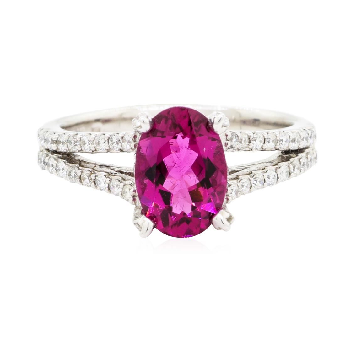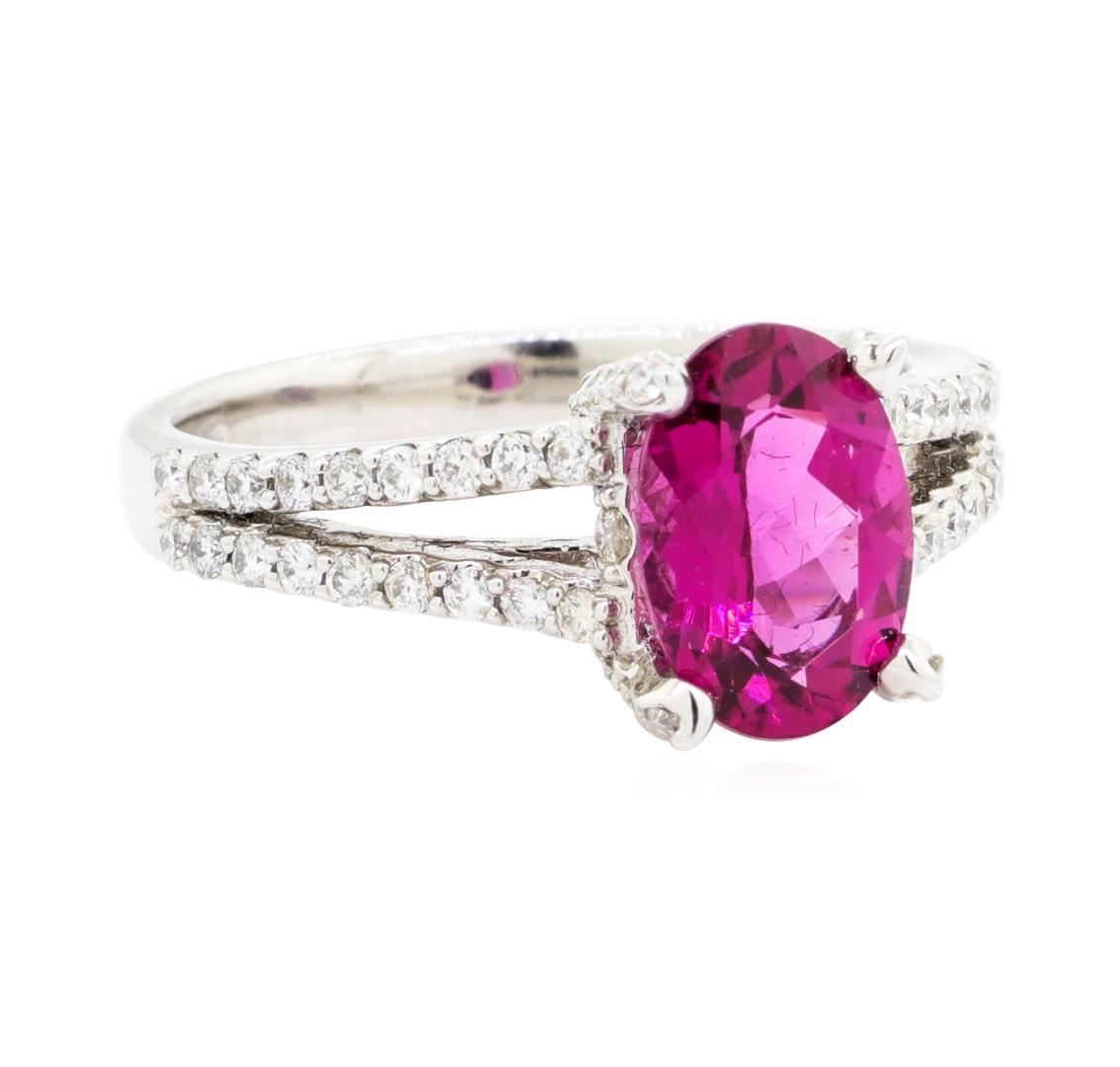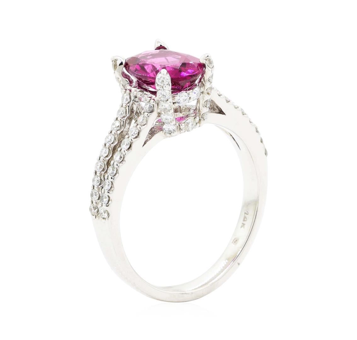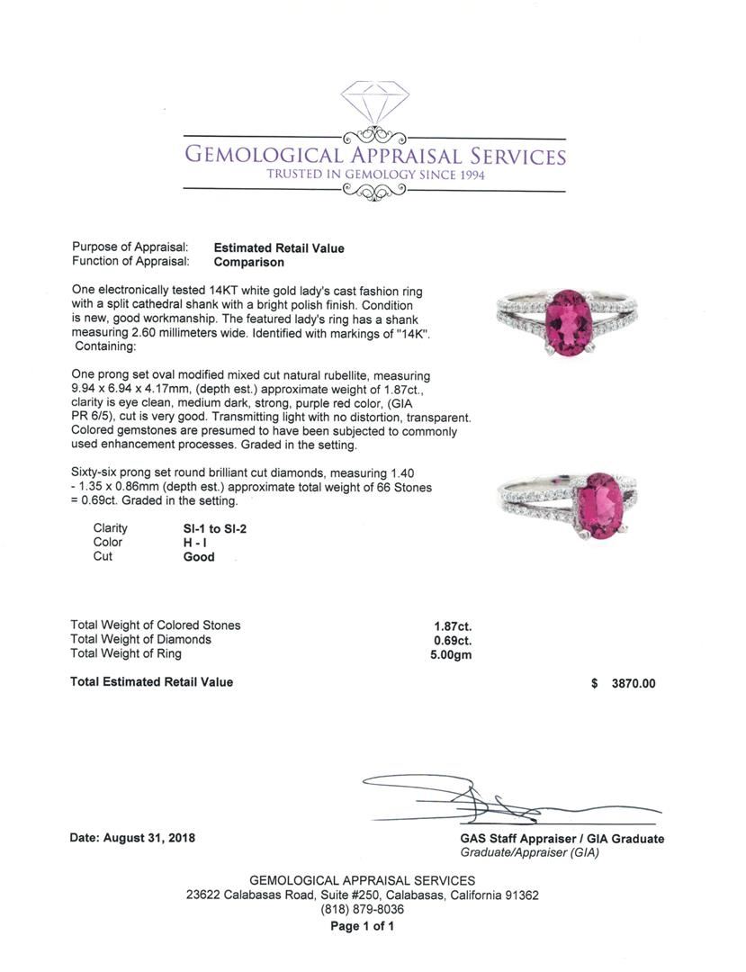 One electronically tested 14KT white gold lady's cast fashion ring with a split cathedral shank with a bright polish finish. The featured lady's ring has a shank measuring 2.60 millimeters wide. Identified with markings of '14K'. Condition is new, good workmanship. Containing: One prong set oval modified mixed cut natural rubellite, measuring 9.94 x 6.94 x 4.17mm, (depth est.) approximate weight of 1.87ct., clarity is eye clean, medium dark, strong, purple red color, (GIA PR 6/5), cut is very good. Transmitting light with no distortion, transparent. Colored gemstones are presumed to have been subjected to commonly used enhancement processes. Graded in the setting. Sixty-Six prong set round brilliant cut diamonds, measuring 1.40 - 1.35 x 0.86mm (depth est.) approximate total weight of 66 Stones = 0.69ct. Graded in the setting. Color H - I Clarity SI-1 to SI-2 Cut Good. Total Weight of Colored Stones 1.87ct.. Total Weight of Diamonds 0.69ct.. Total Weight of Ring 5.00gm GAS Appraised at $3870.00. GAS Appraised at $3,870.00.