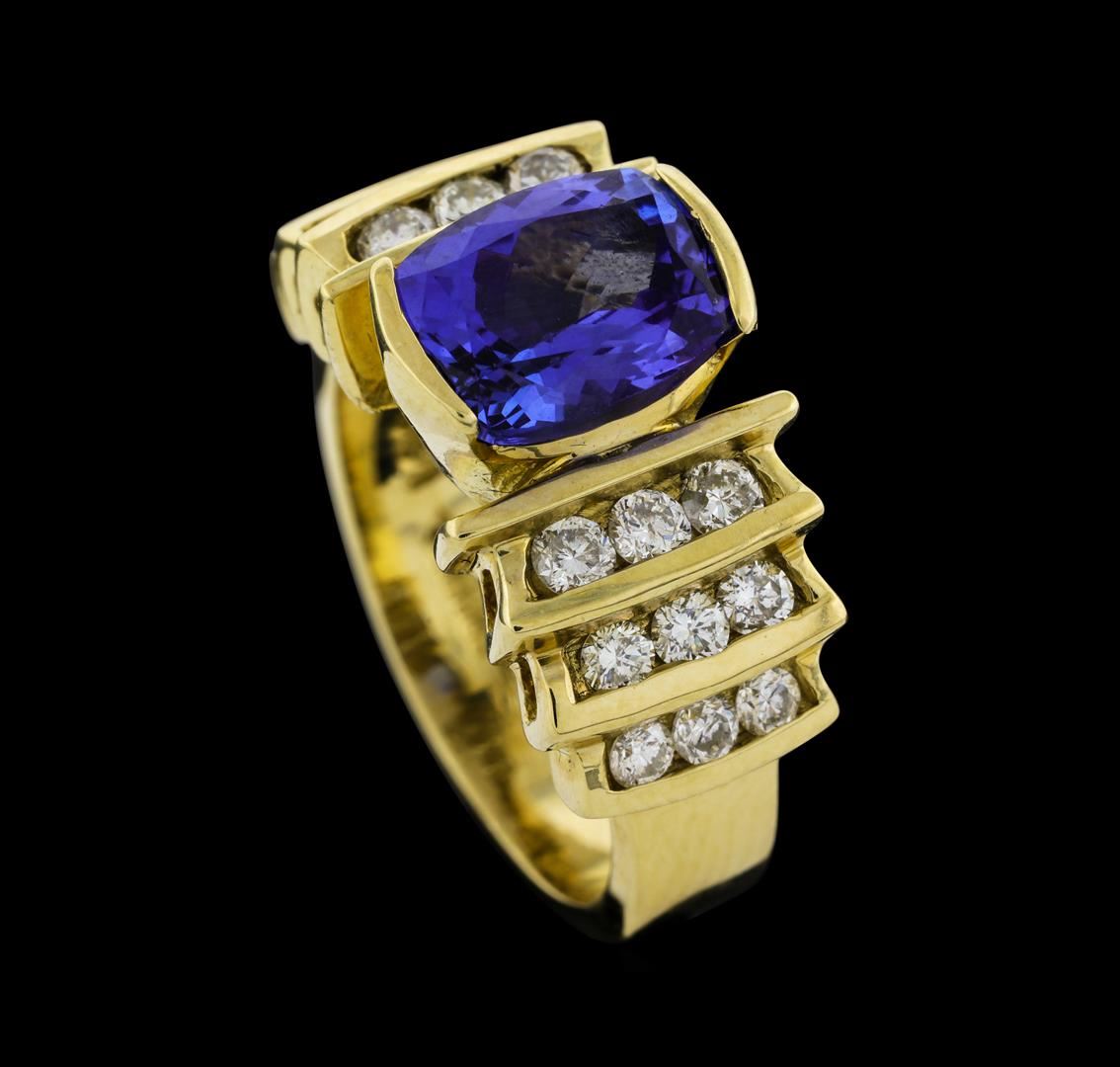 One electronically tested 14KT yellow gold lady's cast fashion ring with a cathedral shank with a bright polish finish. The featured lady's ring has triple tiered diamond set shoulders and a shank measuring 4.80 millimeters wide. Trademark is Adamor. Identified with markings of '14K'. Condition is new, good workmanship. Containing: One channel set oval modified brilliant cut natural tanzanite, measuring 9.40 x 7.14 x 4.97mm, (depth est.) 9%. bulge factor, approximate weight of 2.56ct., clarity is eye clean, medium dark, moderately strong, violetish blue color, (GIA vB 6/4), cut is very good. Transmitting light with no distortion, transparent. Colored gemstones are presumed to have been subjected to commonly used enhancement processes. Graded in the setting. Six channel set round brilliant cut diamonds, measuring 2.50 - 2.40 x 1.52mm (depth est.) approximate total weight of 6 Stones = 0.34ct. Graded in the setting. Clarity SI-1 to SI-2. Color: H - I Cut Good Twelve channel set round brilliant cut diamonds, measuring 2.10 - 2.00 x 1.27mm (depth est.) approximate total weight of 12 Stones = 0.39ct. Graded in the setting. Clarity SI-1 to SI-2. Color: G - H Cut Good. Total Weight of Colored Stones 2.56ct.. Total Weight of Diamonds 0.73ct.. Total Weight of Ring 9.90gm. GAS Appraised at $7,510.00.