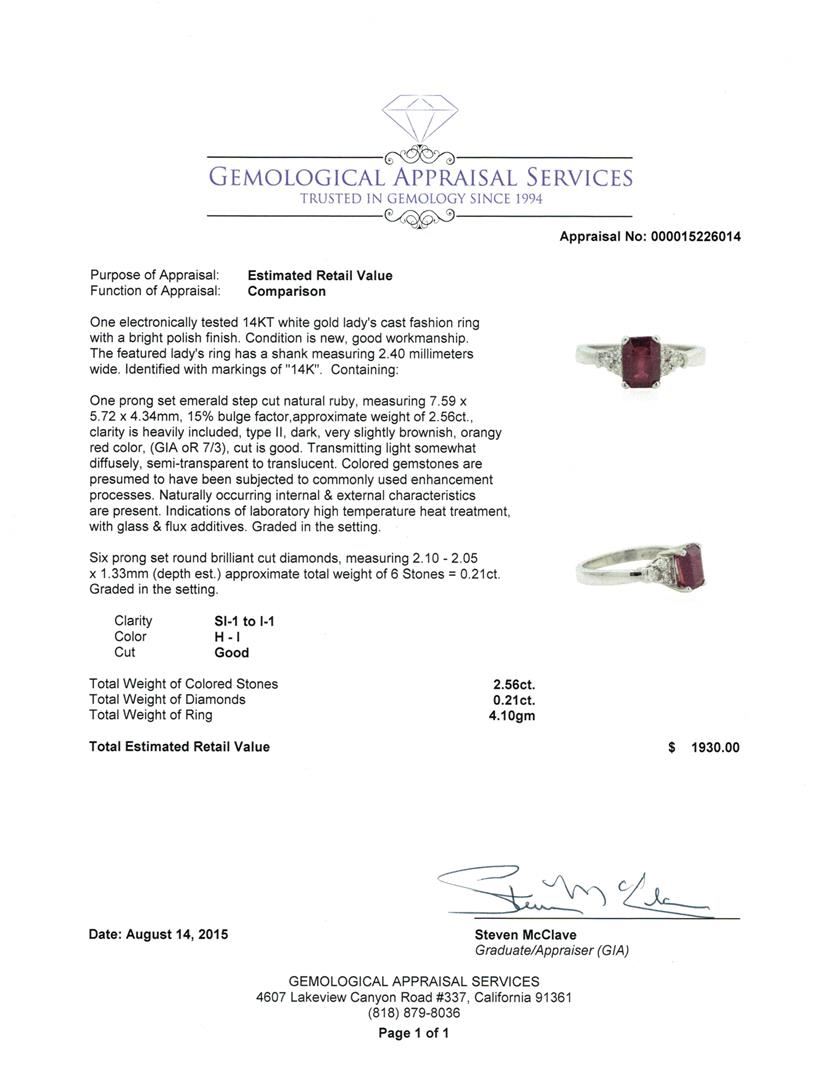 One electronically tested 14KT white gold lady's cast fashion ring with a bright polish finish. The featured lady's ring has a shank measuring 2.40 millimeters wide. Identified with markings of "14K". Condition is new, good workmanship. Containing: One prong set emerald step cut natural ruby, measuring 7.59 x 5.72 x 4.34mm, 15% bulge factor, approximate weight of 2.56ct., clarity is heavily included, type II, dark, very slightly brownish, orangy red color, (GIA oR 7/3), cut is good. Transmitting light somewhat diffusely, semi-transparent to translucent. Colored gemstones are presumed to have been subjected to commonly used enhancement processes. Naturally occurring internal & external characteristics are present. Indications of laboratory high temperature heat treatment, with glass & flux additives. Graded in the setting. Six prong set round brilliant cut diamonds, measuring 2.10 - 2.05 x 1.33mm (depth est.) approximate total weight of 6 Stones = 0.21ct. Graded in the setting. Clarity: SI-1 to I-1. Color: H - I. Cut Good. Total Weight of Colored Stones 2.56ct. Total Weight of Diamonds 0.21ct. Total Weight of Ring 4.10gm. GAS Appraised at $1,930.00.