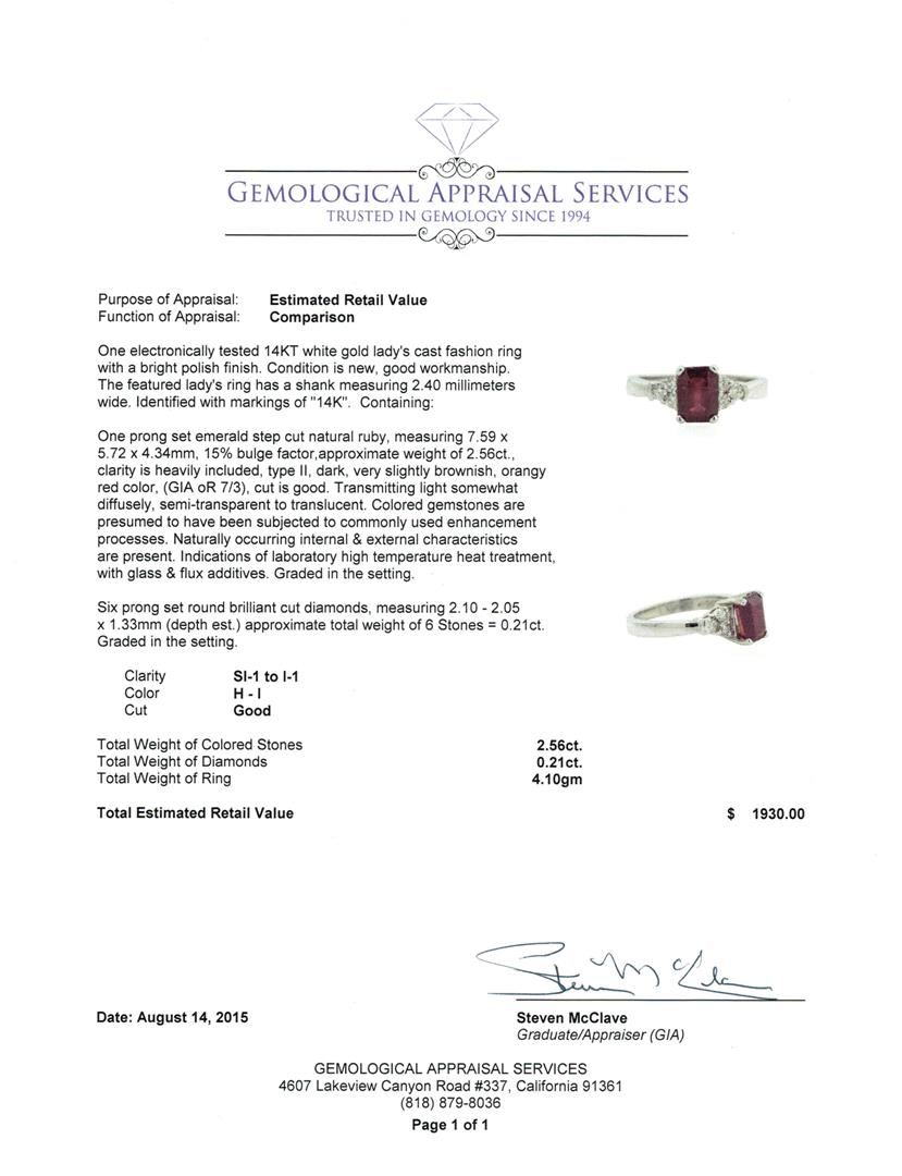 One electronically tested 14KT white gold lady's cast fashion ring with a bright polish finish. The featured lady's ring has a shank measuring 2.40 millimeters wide. Identified with markings of "14K". Condition is new, good workmanship. Containing: One prong set emerald step cut natural ruby, measuring 7.59 x 5.72 x 4.34mm, 15% bulge factor, approximate weight of 2.56ct., clarity is heavily included, type II, dark, very slightly brownish, orangy red color, (GIA oR 7/3), cut is good. Transmitting light somewhat diffusely, semi-transparent to translucent. Colored gemstones are presumed to have been subjected to commonly used enhancement processes. Naturally occurring internal & external characteristics are present. Indications of laboratory high temperature heat treatment, with glass & flux additives. Graded in the setting. Six prong set round brilliant cut diamonds, measuring 2.10 - 2.05 x 1.33mm (depth est.) approximate total weight of 6 Stones = 0.21ct. Graded in the setting. Clarity: SI-1 to I-1. Color: H - I. Cut Good. Total Weight of Colored Stones 2.56ct. Total Weight of Diamonds 0.21ct. Total Weight of Ring 4.10gm. GAS Appraised at $1,930.00.
