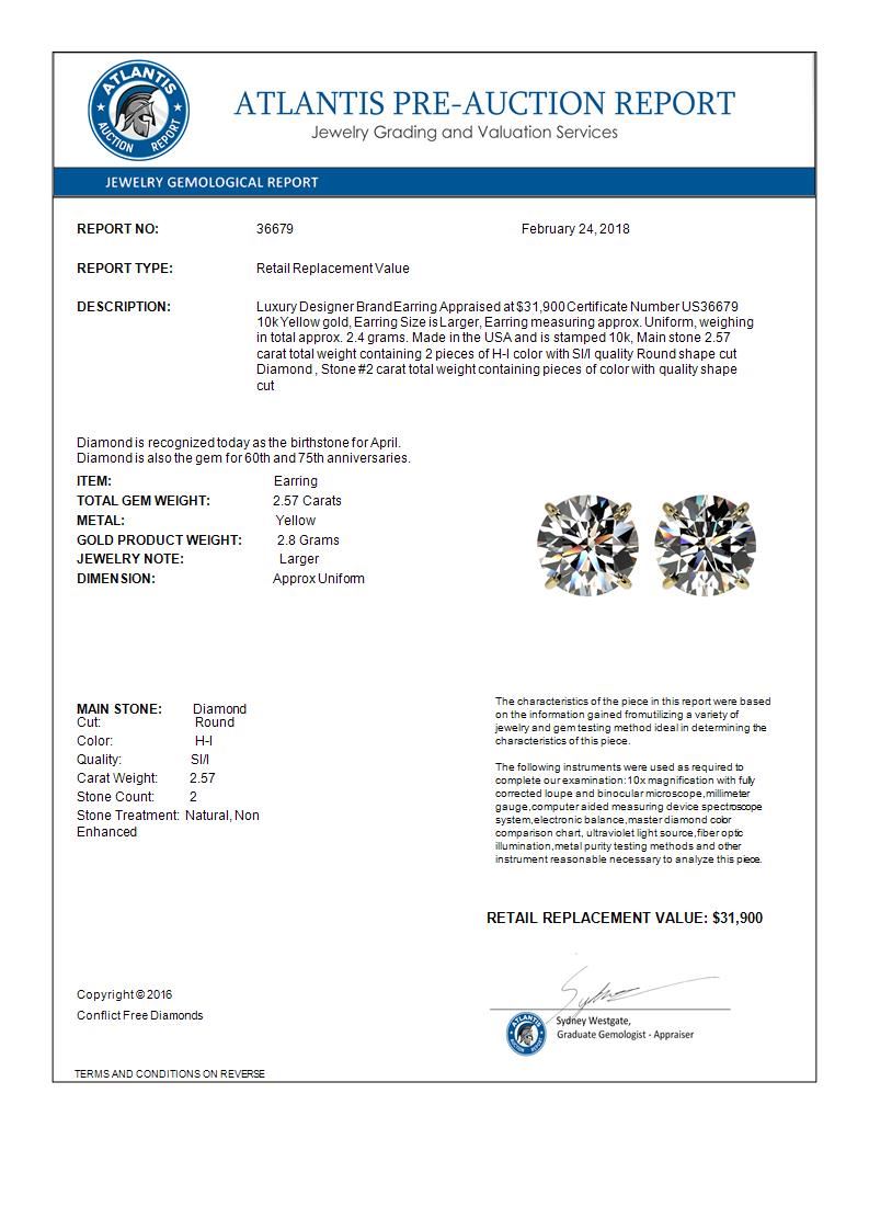 REF-435W2F -36679 ---- 2.57 CTW Certified H-SI/I Quality Diamond Solitaire Stud Earrings 10K Yellow Gold ---- Luxury Designer Brand Earring Appraised at $31,900 Certificate Number US36679 10k Yellow gold, Earring Size is Larger, Earring measuring approx. Uniform, weighing in total approx. 2.4 grams. Made in the USA and is stamped 10k, Main stone 2.57 carat total weight containing 2 pieces of H-I color with SI/I quality Round shape cut Diamond , Stone #2 carat total weight containing pieces of color with quality shape cut