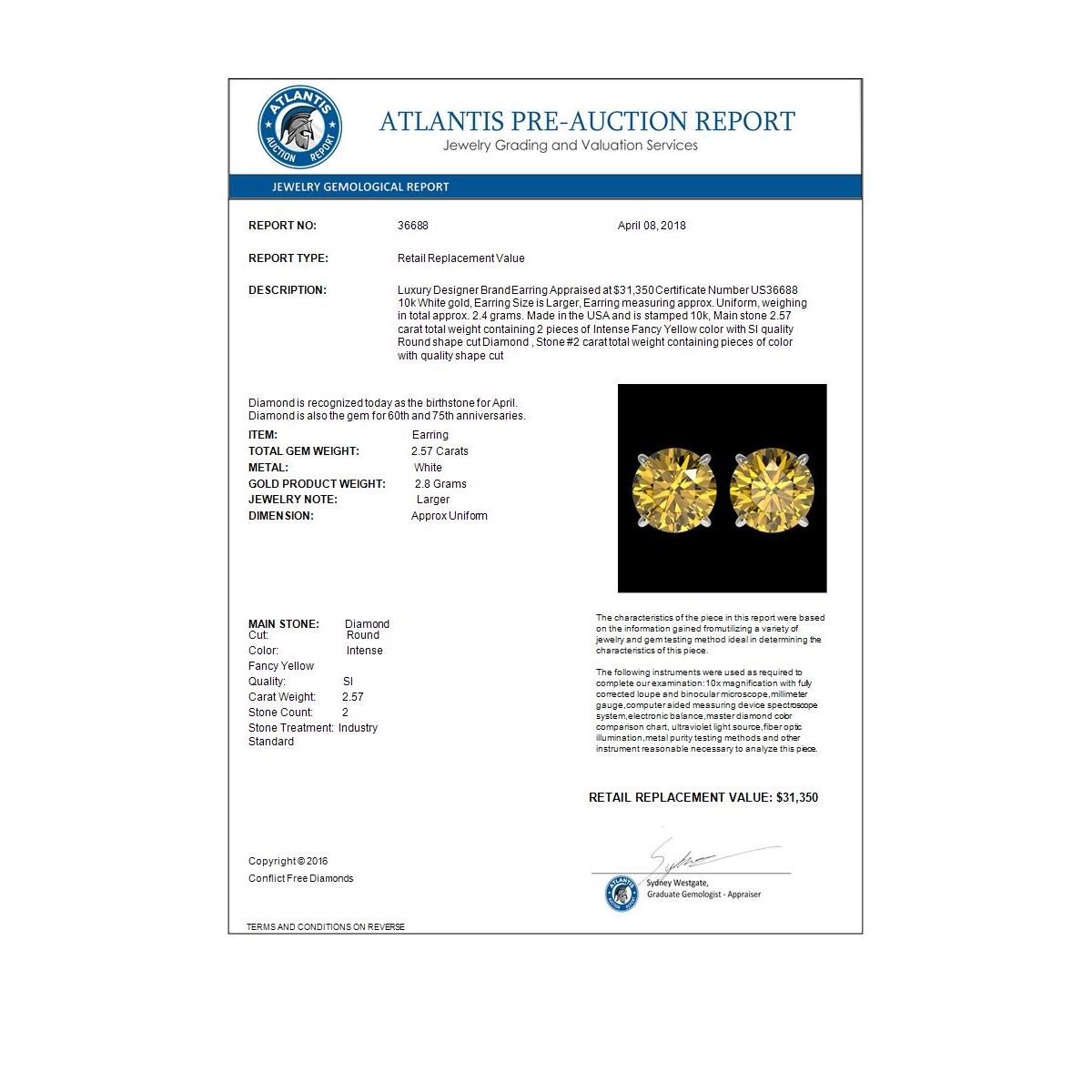 REF-427T5M -36688 ---- 2.57 CTW Certified Intense Yellow SI Diamond Solitaire Stud Earrings 10K White Gold ---- Luxury Designer Brand Earring Appraised at $31,350 Certificate Number US36688  10k White gold,  Earring Size is Larger, Earring measuring approx. Uniform, weighing in total approx. 2.4 grams. Made in the USA and is stamped 10k, Main stone 2.57 carat total weight containing 2 pieces of Intense Fancy Yellow color with SI  quality Round shape cut Diamond , Stone #2  carat total weight containing  pieces of  color with quality  shape cut