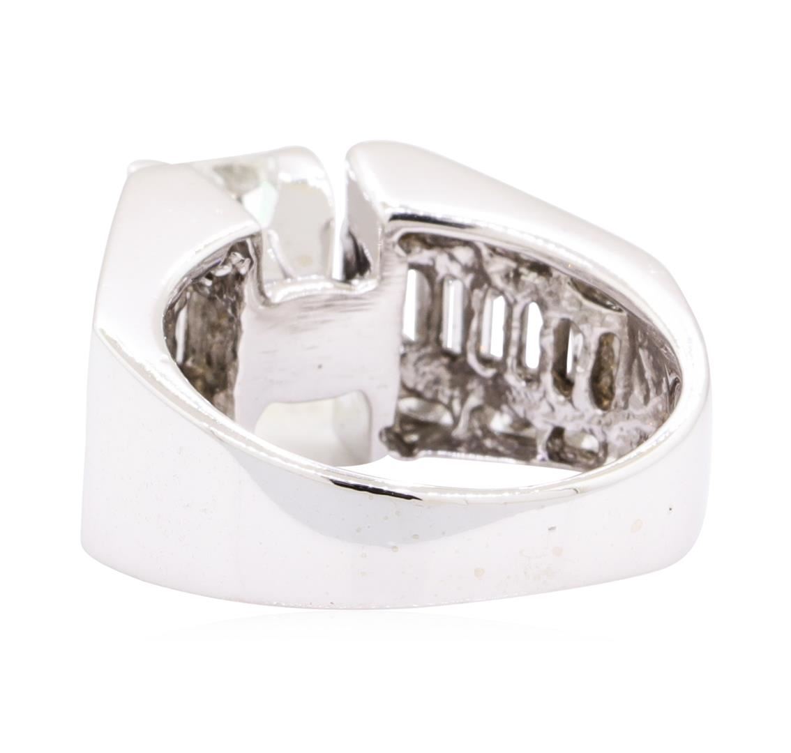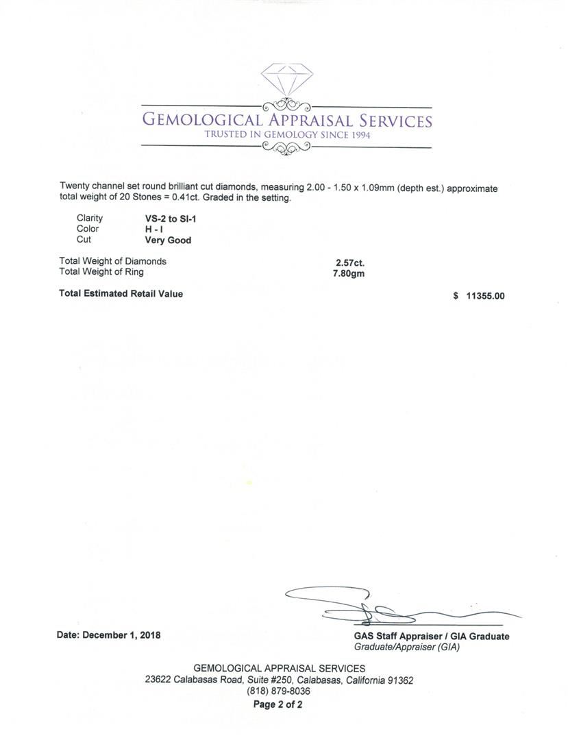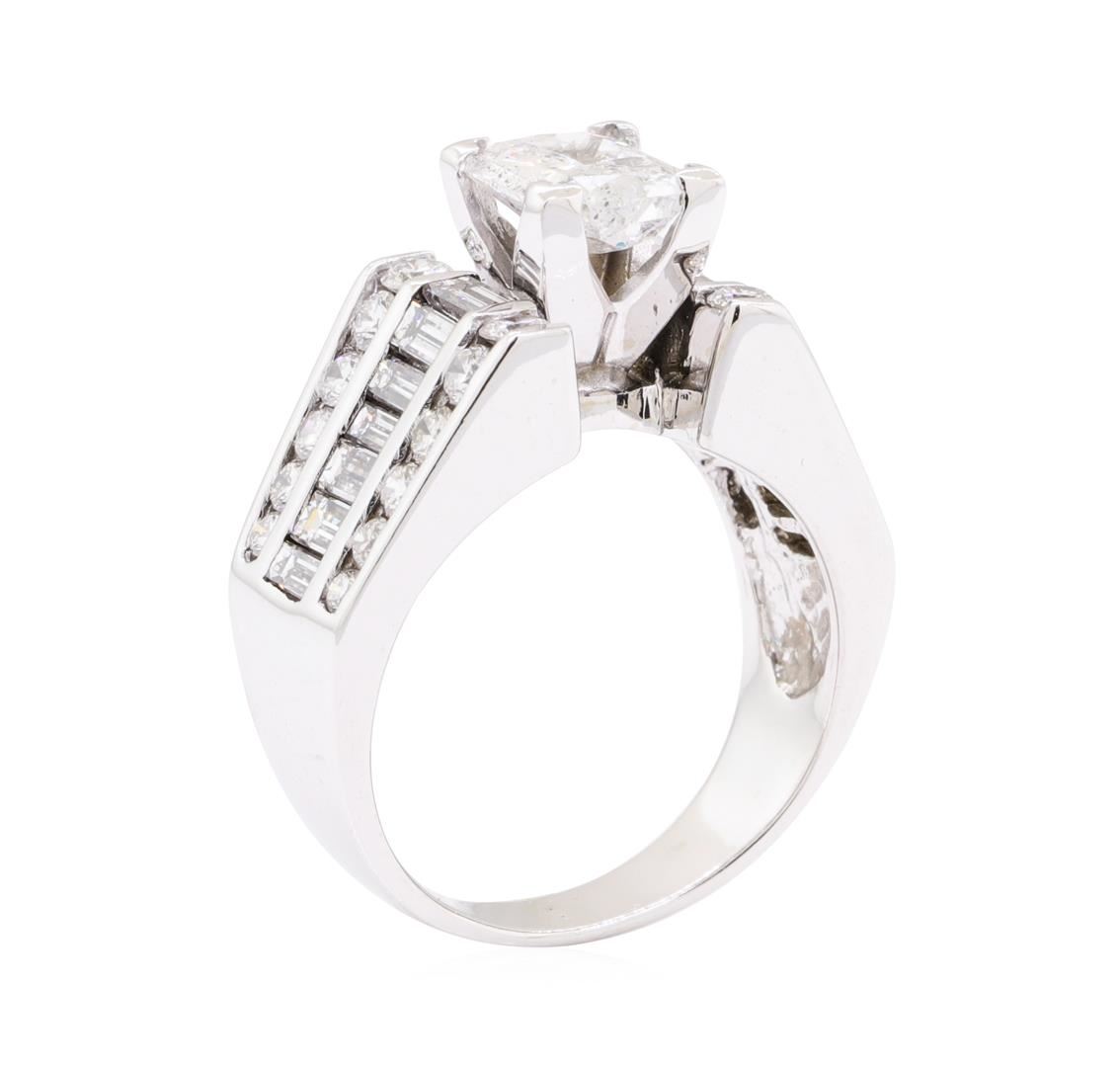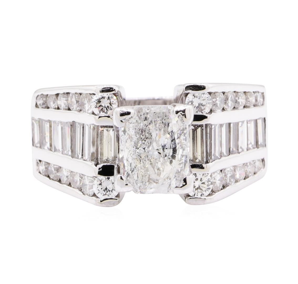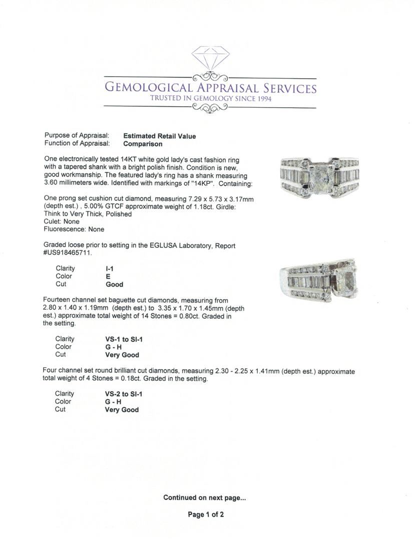 One electronically tested 14KT white gold lady's cast fashion ring with a tapered shank with a bright polish finish. The featured lady's ring has a shank measuring 3.60 millimeters wide. Identified with markings of '14KP'. Condition is new, good workmanship. Containing: One prong set cushion cut diamond, measuring 7.29 x 5.73 x 3.17mm (depth est.) , 5.00.%. GTCF approximate weight of 1.18ct. Girdle: Think to Very Thick, PolishedCulet: NoneFluorescence: NoneGraded loose prior to setting in the EGLUSA Laboratory, Report #US918465711. Color E Clarity I-1 Cut Good Fourteen channel set baguette cut diamonds, measuring from 2.80 x 1.40 x 1.19mm (depth est.) to 3.35 x 1.70 x 1.45mm (depth est.) approximate total weight of 14 Stones = 0.80ct. Graded in the setting. Color G - H Clarity VS-1 to SI-1 Cut Very Good Four channel set round brilliant cut diamonds, measuring 2.30 - 2.25 x 1.41mm (depth est.) approximate total weight of 4 Stones = 0.18ct. Graded in the setting. Color G - H Clarity VS-2 to SI-1 Cut Very Good Twenty channel set round brilliant cut diamonds, measuring 2.00 - 1.50 x 1.09mm (depth est.) approximate total weight of 20 Stones = 0.41ct. Graded in the setting. Color H - I Clarity VS-2 to SI-1 Cut Very Good. Total Weight of Diamonds 2.57ct.. Total Weight of Ring 7.80gm GAS Appraised at $11355.00. GAS Appraised at $11,355.00.