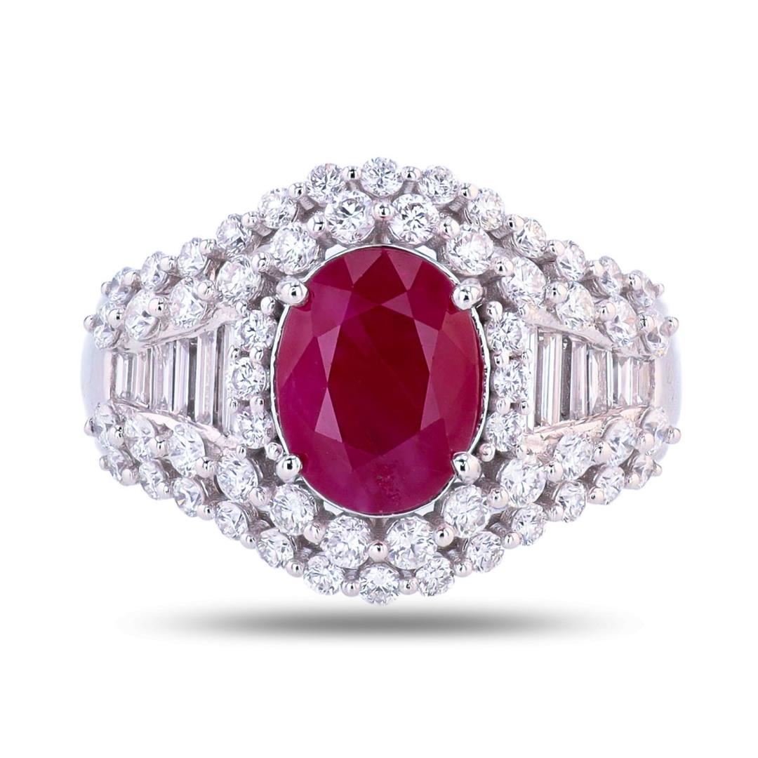 Platinum (PLAT) natural burmese ruby corundum and diamond ring. An oval brilliant cut natural burmese ruby corundum gemstone is mounted in the center of the ring. Baguette and round brilliant cut diamonds accent the ring around and on both sides of the center gemstone. The ring has a gross weight of 8.5 Grams. Reference: GIA Ruby Report 1232450934 #NATURAL GEMSTONE# GEMSTONE: Burma Ruby Corundum; NATURE: Natural; SHAPE: Oval Brilliant, Faceted Cut; WEIGHT: 2.58 carat total; DIMENSIONS: 8.78 x 6.71 x 4.59mm; CLARITY: Type 3; COLOR: Red (5/5); SYMMETRY: Excellent; COLOR INTENSITY: Intense; TRANSPARENCY: Semi-Transparent-Translucent; TONE: Dark #NATURAL DIAMOND# SHAPE: Baguette (12), Round Brilliant (56); WEIGHT: 1.28 carat total; DIMENSIONS: 4.3 x 1.3mm; AVERAGE CLARITY: VS1-VS2; AVERAGE COLOR: F-G; SYMMETRY: Excellent; POLISH: Excellent #METAL# METAL: Platinum; PURITY: 900; COLOR: White; CONDITION: Excellent; FINISH: High Polish #Size: 6 3/4