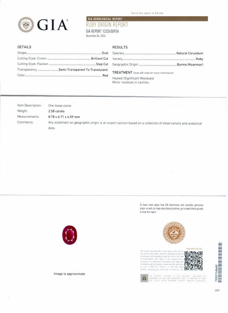 Platinum (PLAT) natural burmese ruby corundum and diamond ring. An oval brilliant cut natural burmese ruby corundum gemstone is mounted in the center of the ring. Baguette and round brilliant cut diamonds accent the ring around and on both sides of the center gemstone. The ring has a gross weight of 8.5 Grams. Reference: GIA Ruby Report 1232450934 #NATURAL GEMSTONE# GEMSTONE: Burma Ruby Corundum; NATURE: Natural; SHAPE: Oval Brilliant, Faceted Cut; WEIGHT: 2.58 carat total; DIMENSIONS: 8.78 x 6.71 x 4.59mm; CLARITY: Type 3; COLOR: Red (5/5); SYMMETRY: Excellent; COLOR INTENSITY: Intense; TRANSPARENCY: Semi-Transparent-Translucent; TONE: Dark #NATURAL DIAMOND# SHAPE: Baguette (12), Round Brilliant (56); WEIGHT: 1.28 carat total; DIMENSIONS: 4.3 x 1.3mm; AVERAGE CLARITY: VS1-VS2; AVERAGE COLOR: F-G; SYMMETRY: Excellent; POLISH: Excellent #METAL# METAL: Platinum; PURITY: 900; COLOR: White; CONDITION: Excellent; FINISH: High Polish #Size: 6 3/4