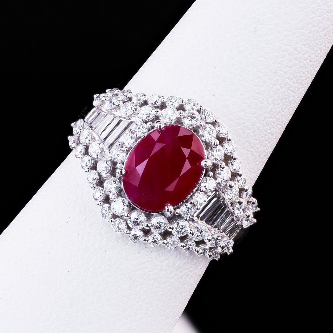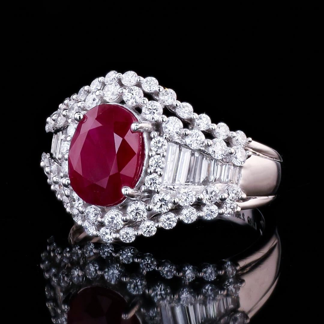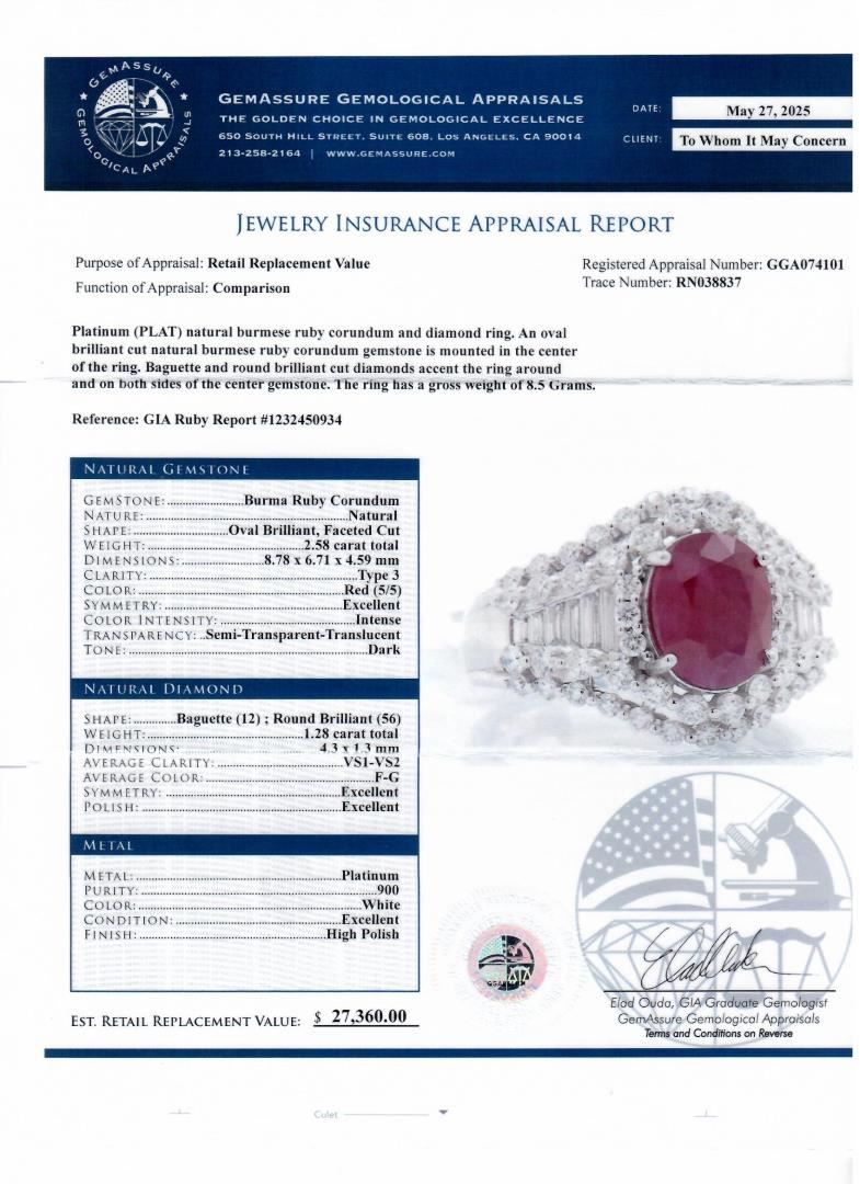Platinum (PLAT) natural burmese ruby corundum and diamond ring. An oval brilliant cut natural burmese ruby corundum gemstone is mounted in the center of the ring. Baguette and round brilliant cut diamonds accent the ring around and on both sides of the center gemstone. The ring has a gross weight of 8.5 Grams. Reference: GIA Ruby Report 1232450934 #NATURAL GEMSTONE# GEMSTONE: Burma Ruby Corundum; NATURE: Natural; SHAPE: Oval Brilliant, Faceted Cut; WEIGHT: 2.58 carat total; DIMENSIONS: 8.78 x 6.71 x 4.59mm; CLARITY: Type 3; COLOR: Red (5/5); SYMMETRY: Excellent; COLOR INTENSITY: Intense; TRANSPARENCY: Semi-Transparent-Translucent; TONE: Dark #NATURAL DIAMOND# SHAPE: Baguette (12), Round Brilliant (56); WEIGHT: 1.28 carat total; DIMENSIONS: 4.3 x 1.3mm; AVERAGE CLARITY: VS1-VS2; AVERAGE COLOR: F-G; SYMMETRY: Excellent; POLISH: Excellent #METAL# METAL: Platinum; PURITY: 900; COLOR: White; CONDITION: Excellent; FINISH: High Polish #Size: 6 3/4