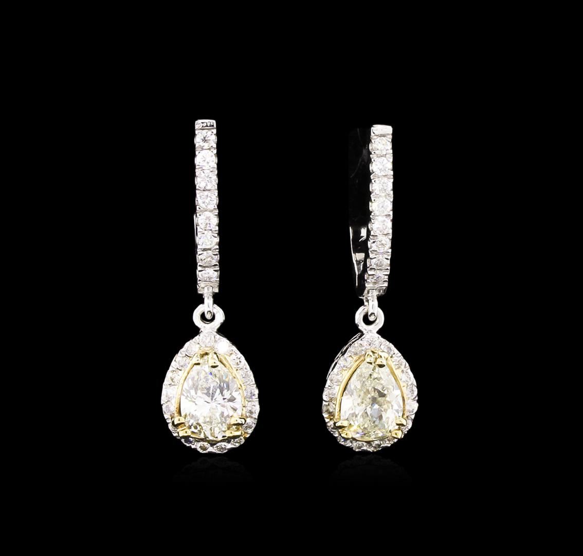 One pair electronically tested 14KT white and yellow gold lady's combination cast & assembled dangle earrings with hinged, snap locking posts with a bright polish finish. Identified with markings of "14K". Condition is new, good workmanship. Containing: Two prong set pear shaped cut diamonds, measuring 7.85 x 5.50 x 3.47mm (depth est.) , 5.00.%. GTCF approximate total weight of 2 Stones = 1.92ct. Graded in the setting. Clarity: SI-1. Color: K - M. Cut Good Fifty prong set round brilliant cut diamonds, measuring 1.50 - 1.45 x 0.96mm (depth est.) approximate total weight of 50 Stones = 0.66ct. Graded in the setting. Clarity: SI-1 to I-1. Color: G - I. Cut Good. Total Weight of Diamonds 2.58ct. Total Weight of Earrings 6.60gm. GAS Appraised at $16,270.00.