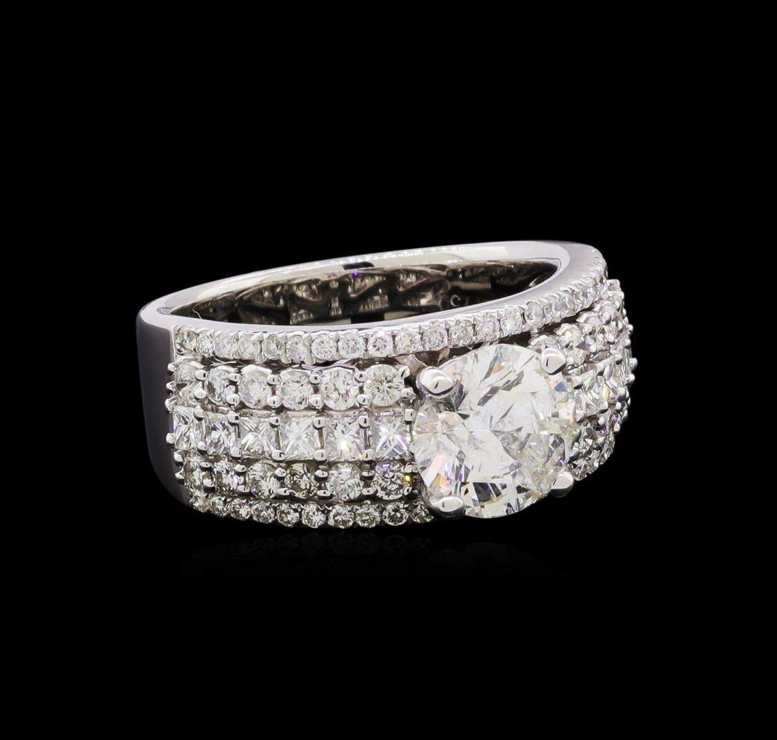 One electronically tested 18KT white gold lady's cast wedding ring with a tapered shank with a bright polish finish. The featured lady's ring has a shank measuring 4.95 millimeters wide. Identified with markings of "18K 750". Condition is new, good workmanship. Containing: One prong set round brilliant cut diamond, measuring 7.38 - 7.36 x 4.56mm (depth est.) approximate weight of 1.51ct. Graded in the setting. Clarity: I-1. Color: G - Very Good Twelve prong set princess cut diamonds, measuring 1.90 x 1.80 x 1.35mm (depth est.) approximate total weight of 12 Stones = 0.45ct. Graded in the setting. Clarity: VS-2 to SI-1. Color: G - Very Good Twenty-Four prong set round brilliant cut diamonds, measuring 1.70 - 1.60 x 1.02mm (depth est.) approximate total weight of 24 Stones = 0.40ct. Graded in the setting. Clarity: SI-1 to SI-2. Color: G - I. Cut Good Forty-Six prong set round brilliant cut diamonds, measuring 1.10 - 1.05 x 0.67mm (depth est.) approximate total weight of 46 Stones = 0.22ct. Graded in the setting. Clarity: SI-1 to SI-2. Color: G - I. Cut Good. Total Weight of Diamonds 2.58ct. Total Weight of Ring 8.00gm GAS Appraised at $20,355.00.