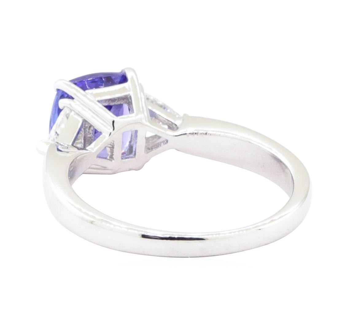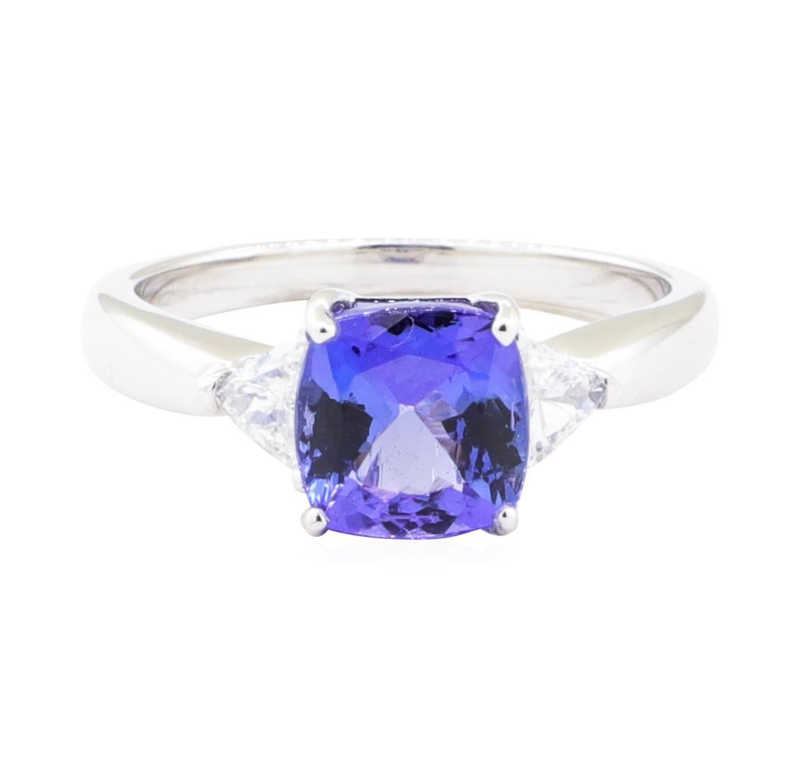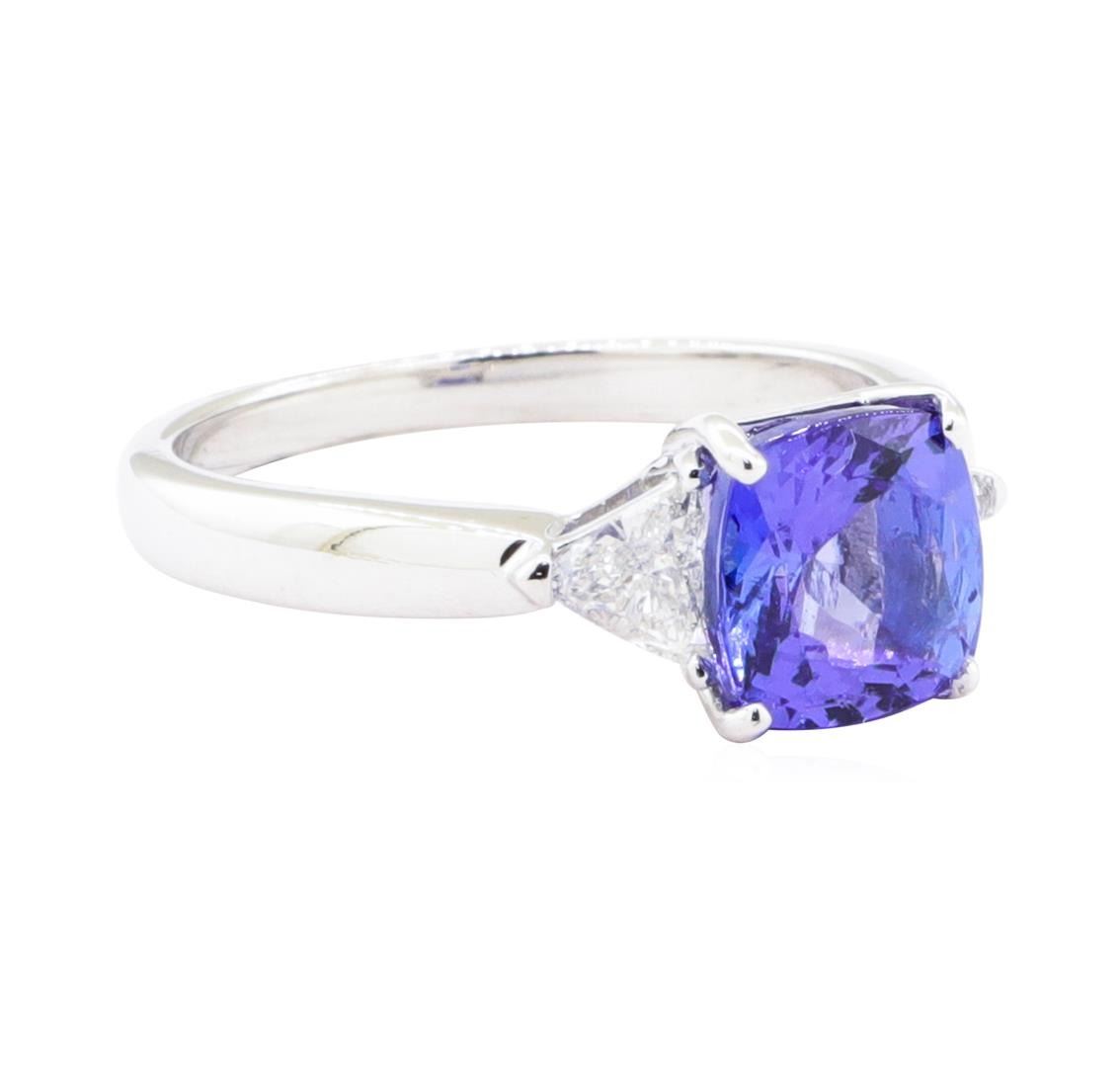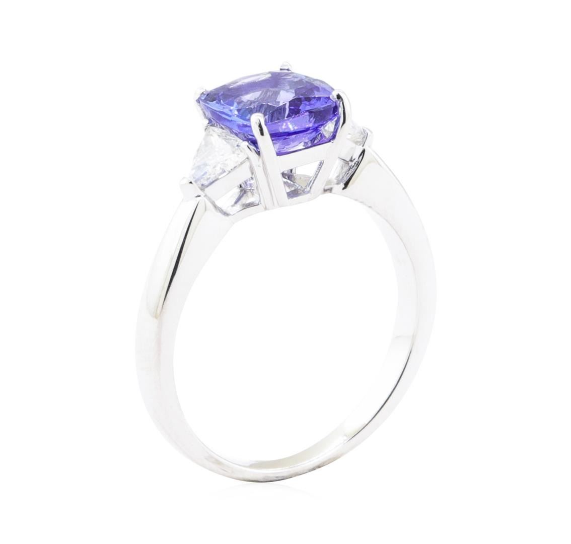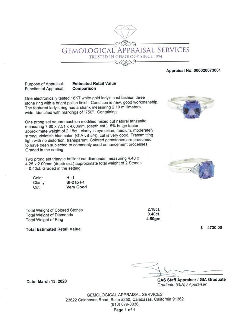 One electronically tested 18KT white gold lady's cast fashion three stone ring with a bright polish finish. The featured lady's ring has a shank measuring 2.10 millimeters wide. Identified with markings of '750'. Condition is new, good workmanship. Containing: One prong set square cushion modified mixed cut natural tanzanite, measuring 7.60 x 7.51 x 4.60mm, (depth est.) 5%. bulge factor, approximate weight of 2.18ct., clarity is eye clean, medium, moderately strong, violetish blue color, (GIA vB 5/4), cut is very good. Transmitting light with no distortion, transparent. Colored gemstones are presumed to have been subjected to commonly used enhancement processes. Graded in the setting. Two prong set triangle brilliant cut diamonds, measuring 4.40 x 4.25 x 2.00mm (depth est.) approximate total weight of 2 Stones = 0.40ct. Graded in the setting. Color H - I Clarity SI-2 to I-1 Cut Very Good. Total Weight of Colored Stones 2.18ct.. Total Weight of Diamonds 0.40ct.. Total Weight of Ring 4.50gm GAS Appraised at $4730.00. GAS Appraised.
