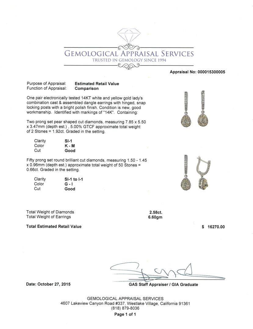 One pair electronically tested 14KT white and yellow gold lady's combination cast & assembled dangle earrings with hinged, snap locking posts with a bright polish finish. Identified with markings of "14K". Condition is new, good workmanship. Containing: Two prong set pear shaped cut diamonds, measuring 7.85 x 5.50 x 3.47mm (depth est.) , 5.00.%. GTCF approximate total weight of 2 Stones = 1.92ct. Graded in the setting. Clarity: SI-1. Color: K - M. Cut Good Fifty prong set round brilliant cut diamonds, measuring 1.50 - 1.45 x 0.96mm (depth est.) approximate total weight of 50 Stones = 0.66ct. Graded in the setting. Clarity: SI-1 to I-1. Color: G - I. Cut Good. Total Weight of Diamonds 2.58ct. Total Weight of Earrings 6.60gm. GAS Appraised at $16,270.00.
