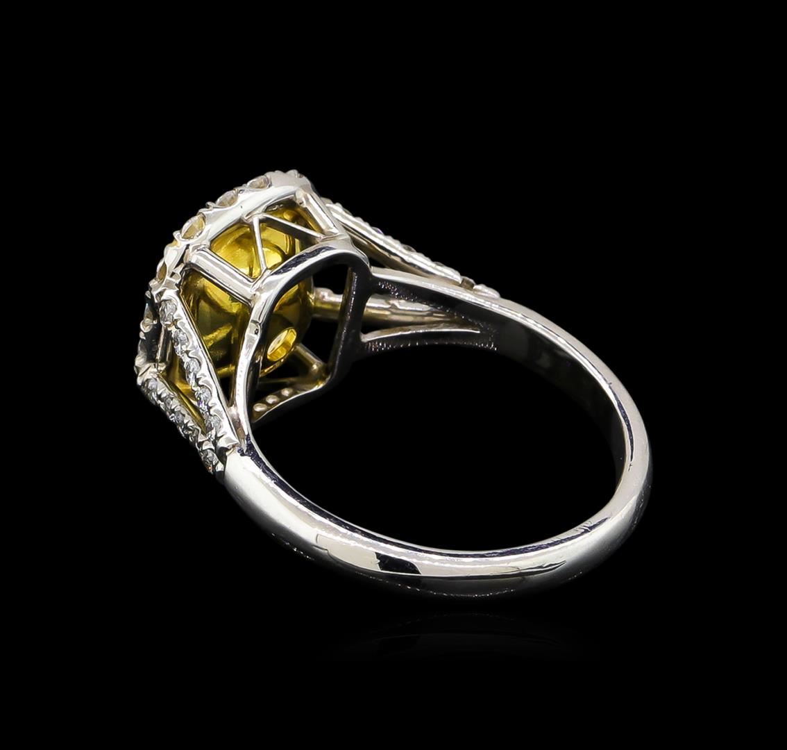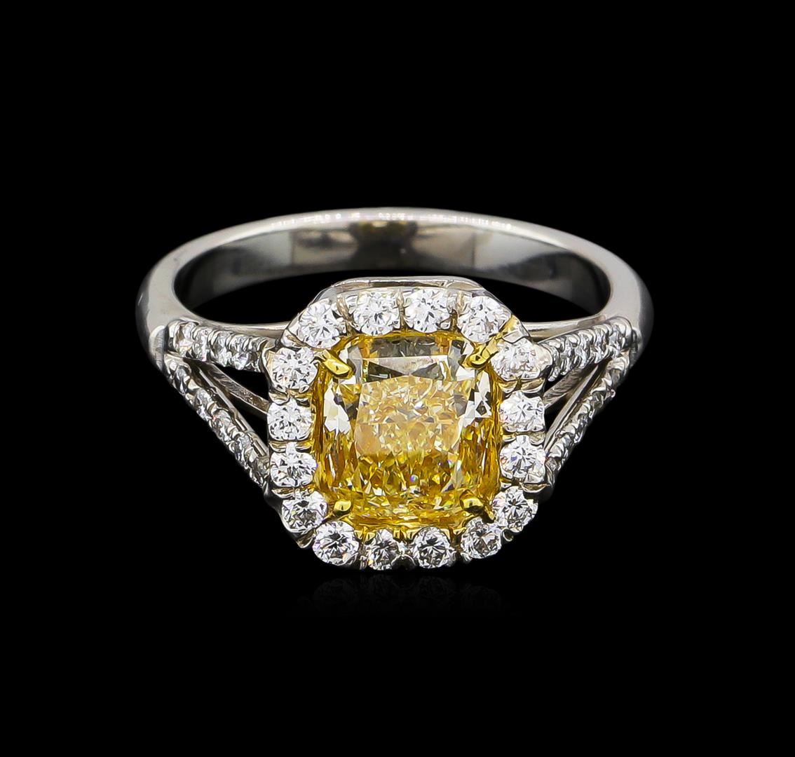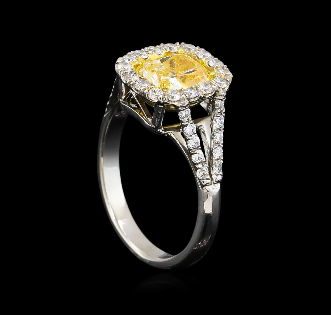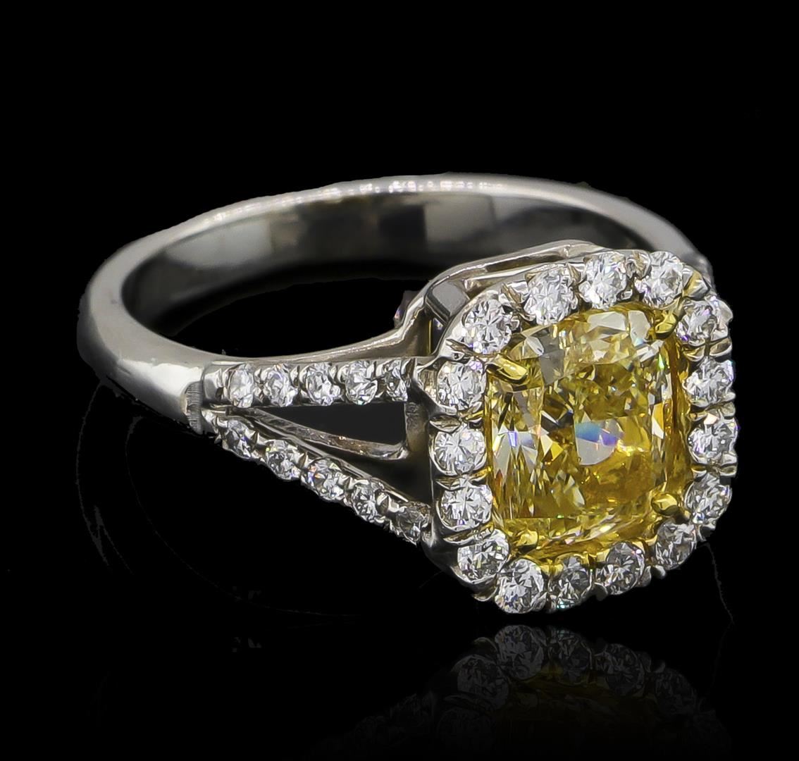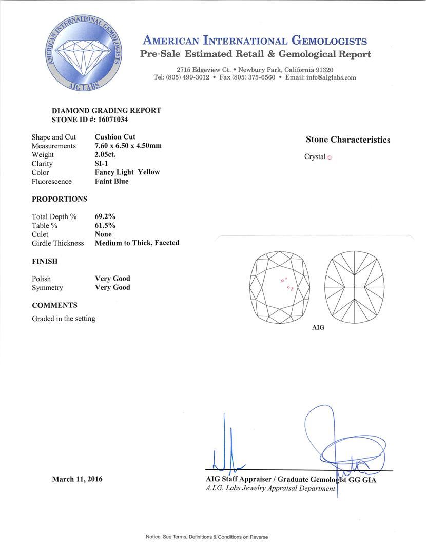One electronically tested platinum ladies cast diamond ring. The featured diamond is set within an inner yellow gold basket and an outer diamond bezel supported by diamond set split shoulders, completed by a two and one-half millimeter wide band. Identified with markings of "PT 950". Condition is good. Containing: One prong set cushion cut diamond, measuring 7.60 x 6.50 x 4.50mm (depth est.), 6.00.%. GTCF approximate weight of 2.05ct with a faint blue fluorescence. Diamond Grading Report attached. Graded in the setting. Clarity: SI-1. Depth: 69.2%. Table 61.5%. Thirty-Six prong set round brilliant cut diamonds, measuring 1.60 - 1.40 x 0.90mm (depth est.) approximate total weight of 36 Stones = 0.54ct. Graded in the setting. Clarity: VS-1 to VS-2. Color: F - H. Total Weight of Diamonds 2.59ct. Total Weight of Ring 6.78gm. AIG Appraised at $33,170.00.