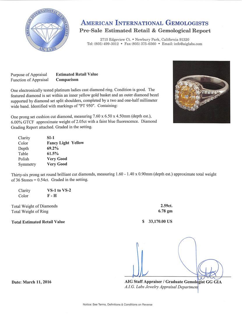 One electronically tested platinum ladies cast diamond ring. The featured diamond is set within an inner yellow gold basket and an outer diamond bezel supported by diamond set split shoulders, completed by a two and one-half millimeter wide band. Identified with markings of "PT 950". Condition is good. Containing: One prong set cushion cut diamond, measuring 7.60 x 6.50 x 4.50mm (depth est.), 6.00.%. GTCF approximate weight of 2.05ct with a faint blue fluorescence. Diamond Grading Report attached. Graded in the setting. Clarity: SI-1. Depth: 69.2%. Table 61.5%. Thirty-Six prong set round brilliant cut diamonds, measuring 1.60 - 1.40 x 0.90mm (depth est.) approximate total weight of 36 Stones = 0.54ct. Graded in the setting. Clarity: VS-1 to VS-2. Color: F - H. Total Weight of Diamonds 2.59ct. Total Weight of Ring 6.78gm. AIG Appraised at $33,170.00.