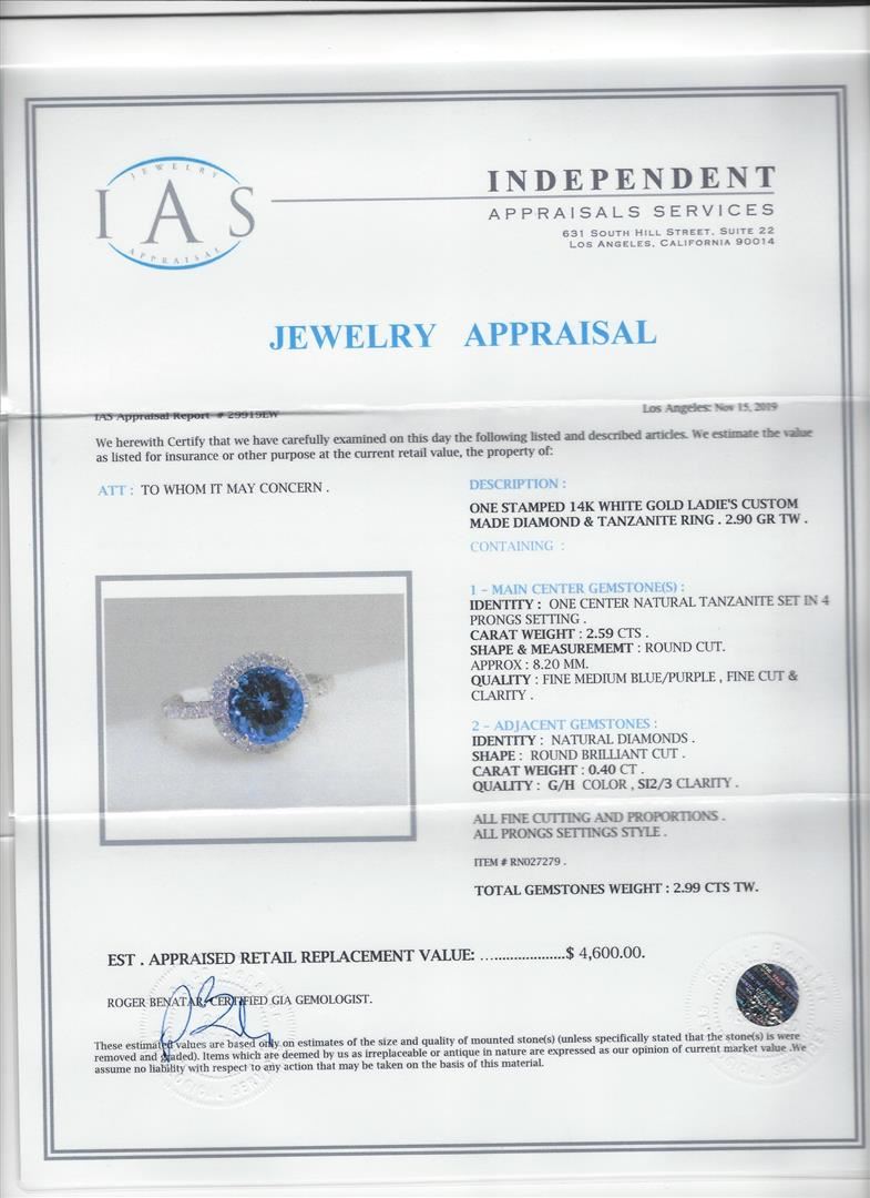 One 2.59ct Tanzanite and Diamond Ring - 14KT White Gold . IAS certified. See Appraisal for more details.