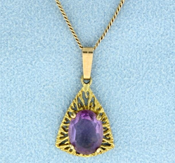 In 9K yellow gold, the pendant is 1 inch long and contains a 9x7mm oval amethyst gemstone with great color and clarity. The chain is 18 inches long. 2.5g
