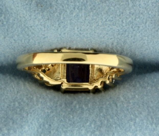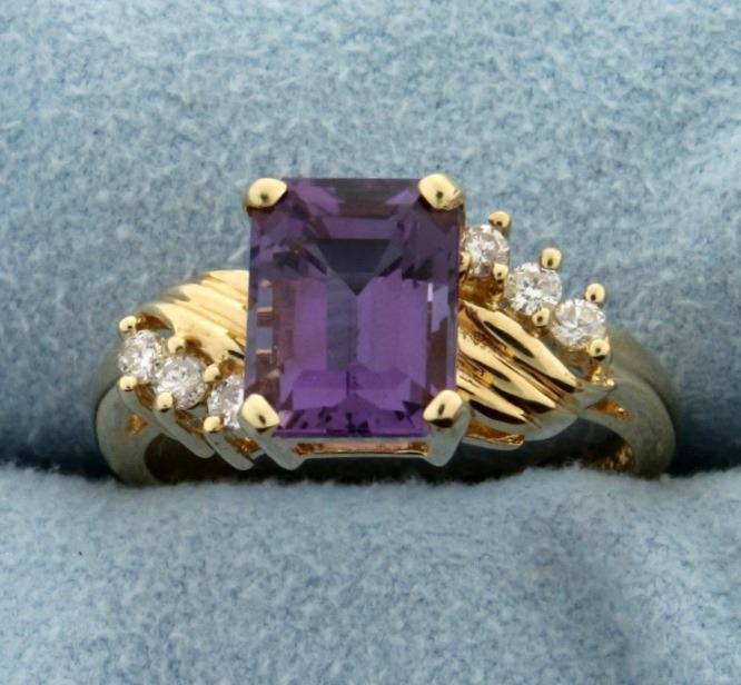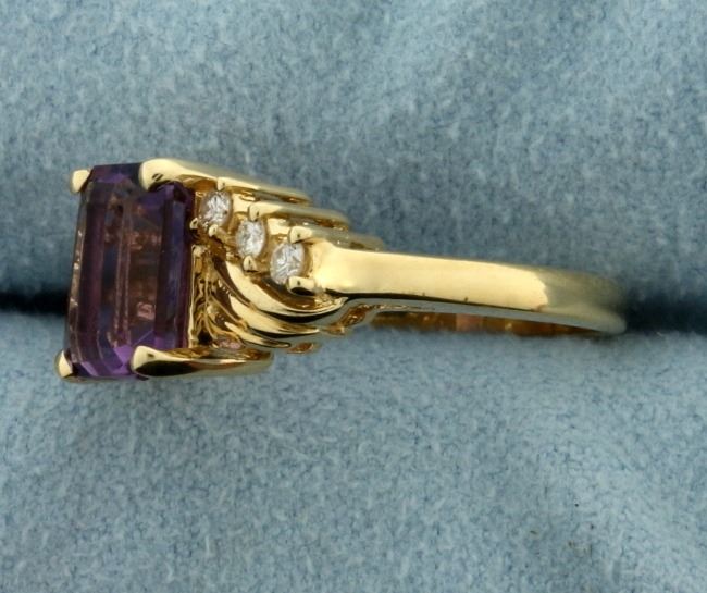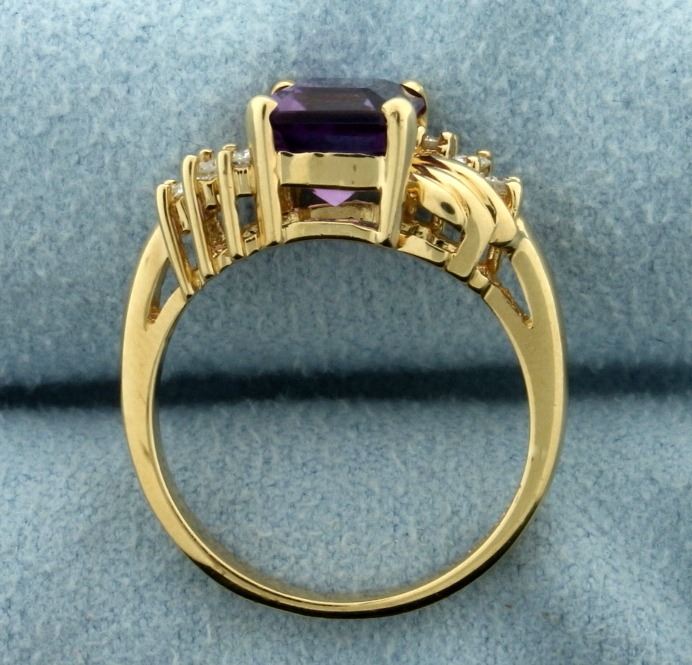 In 14k yellow gold. Contains an emerald cut 2.5ct natural amethyst gemstone with bright purple color and excellent clarity. Also contains six high quality .02 ct diamonds, SI clarity/H color. Size 7. 3.9g.