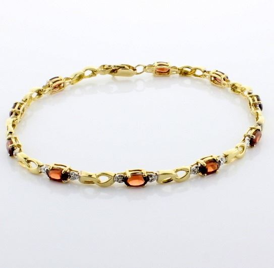 10K yellow & white gold, the bracelet is 7 inches long and has a lobster clasp. It contains ten 5x3mm oval garnet gemstones, that have excellent color and clarity. Also this bracelet contains two 1/2pt round diamonds. 4.2g