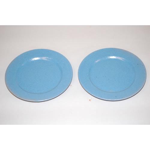 (2) 6 1/2" PAUL REVERE POTTERY PLATES - (2) 6 1/2" BLUE PAUL REVERE ART POTTERY PLATES W/ BLACK MAN ON RUNNING HORSE MARK - WEAR, IMPERFECTIONS