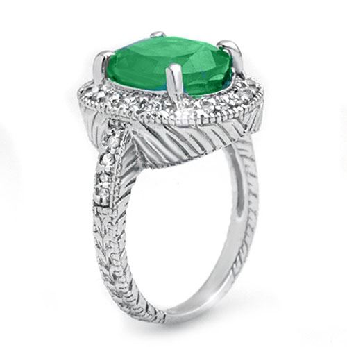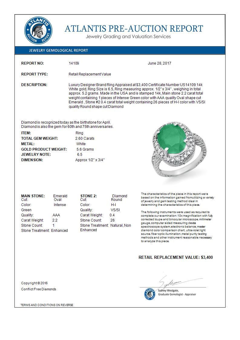 2.60 CTW Emerald & Diamond Ring 14K White Gold ---- Luxury Designer Brand Ring Appraised Retail Price at $3,400 ---- SKU Number US14109 14k White gold Ring Size is 6.5, Ring measuring approx. 1/2" x 3/4" , weighing in total approx. 5.2 grams. Made in the USA and is stamped 14k, Main stone 2.2 carat total weight containing 1 pieces of Intense Green color with AAA quality Oval shape cut Emerald , Stone #2 0.4 carat total weight containing 26 pieces of H-I color with VS/SI quality Round shape cut
