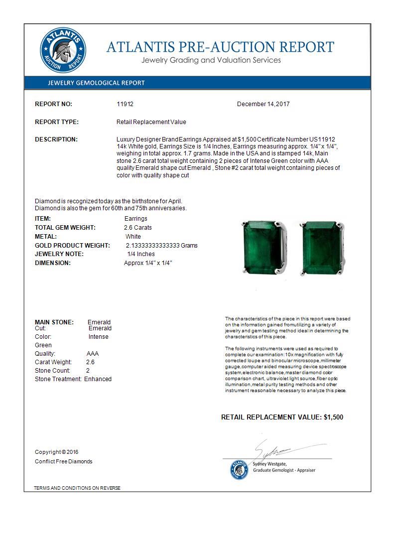 REF-22W5F -11912 ---- 2.60 CTW Emerald Earrings 14K White Gold ---- Luxury Designer Brand Earrings Appraised at $1,500 Certificate Number US11912 14k White gold, Earrings Size is 1/4 Inches, Earrings measuring approx. 1/4" x 1/4", weighing in total approx. 1.7 grams. Made in the USA and is stamped 14k, Main stone 2.6 carat total weight containing 2 pieces of Intense Green color with AAA quality Emerald shape cut Emerald , Stone #2 carat total weight containing pieces of color with quality shape cut