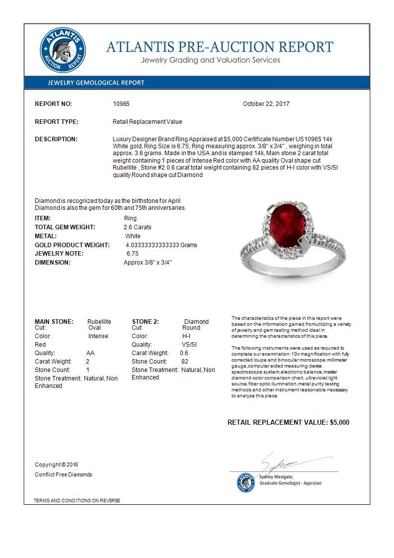 10965 - REF-65M3F ---- 2.60 CTW Rubellite & Diamond Ring 14K White Gold ---- Luxury Designer Brand Ring Appraised at $5,000 Certificate Number US10965 14k White gold, Ring Size is 6.75, Ring measuring approx. 3/8" x 3/4" , weighing in total approx. 3.6 grams. Made in the USA and is stamped 14k, Main stone 2 carat total weight containing 1 pieces of Intense Red color with AA quality Oval shape cut Rubellite , Stone #2 0.6 carat total weight containing 82 pieces of H-I color with VS/SI quality Round shape cut Diamond
