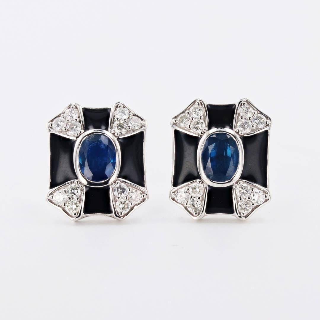 Platinum (PLAT) natural sapphire corundum and diamond earrings. Two (2) oval cut natural sapphire corundum gemstones are mounted in the center of the earrings. Round brilliant cut diamonds accent the earrings around and on both sides of the center gemstones. The earrings have a gross weight of 14.2 Grams. (Black Enamel Set in the Center of the Earrings) NATURAL GEMSTONE : Sapphire Corundum NATURE: Natural SHAPE: Oval Brilliant, Faceted Cut WEIGHT: 2.60 carat total (2pcs.) DIMENSIONS: 8.6 x 7.0mm CLARITY: Type 3 COLOR: Blue (5/5) SYMMETRY: Excellent COLOR INTENSITY: Intense TRANSPARENCY: Transparent TONE: Dark NATURAL DIAMOND SHAPE: Round Brilliant Cut WEIGHT: 1.11 carat total (24pcs.) DIMENSIONS: 2.5 x 2.3mm AVERAGE CLARITY: SI1 to SI2 AVERAGE COLOR: G - H SYMMETRY: Excellent POLISH: Excellent METAL: METAL: Platinum PURITY: 950 COLOR: White CONDITION: Excellent FINISH: High Polish #LREF-5569