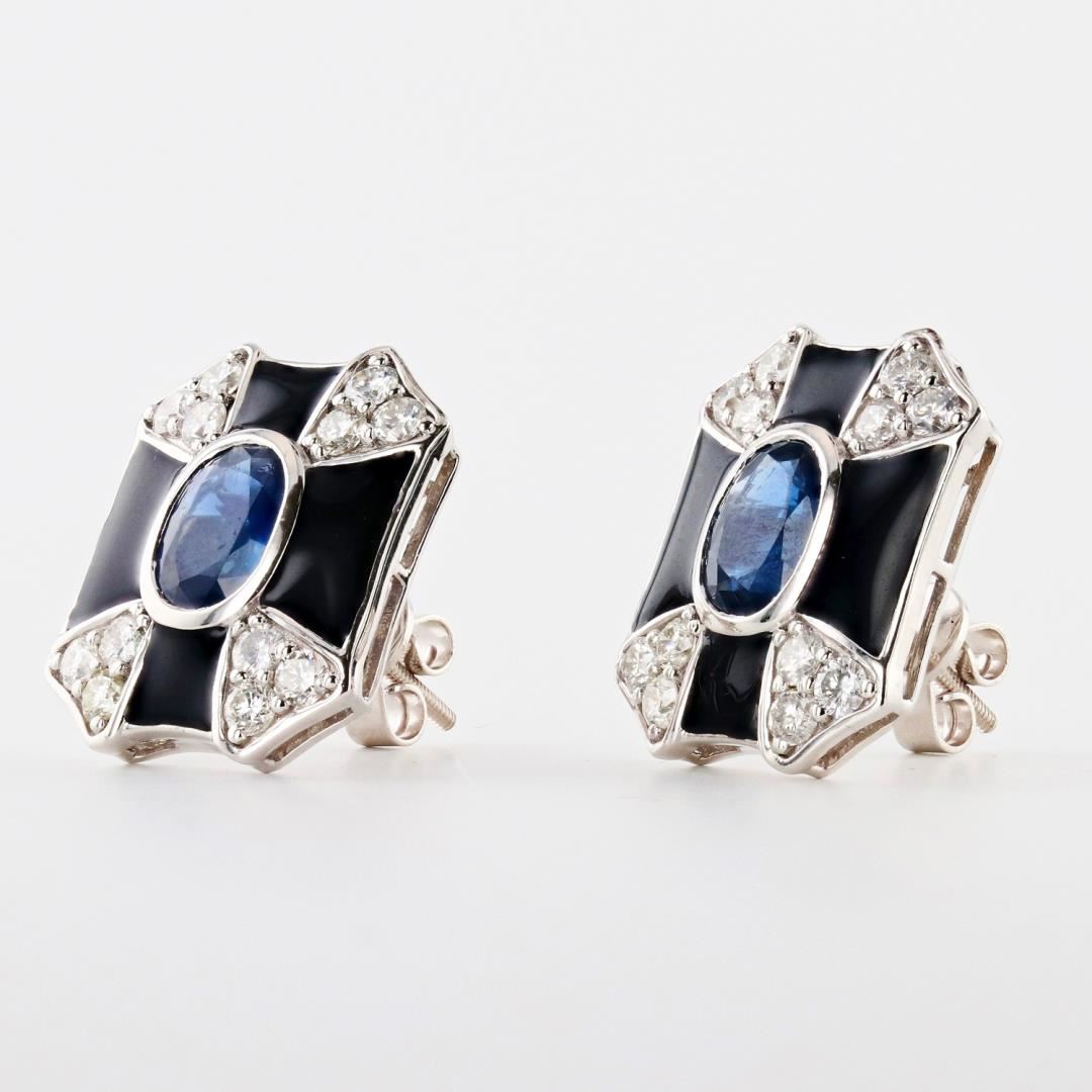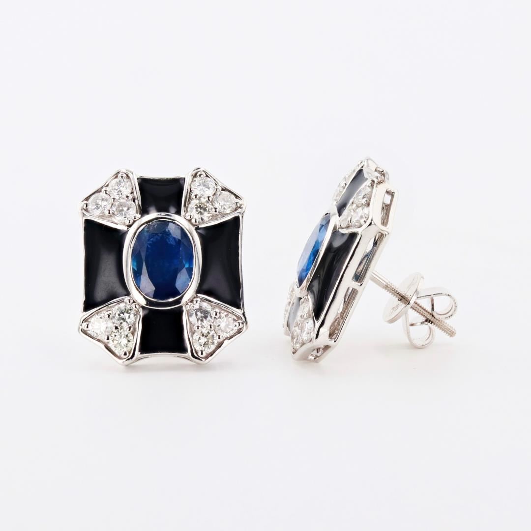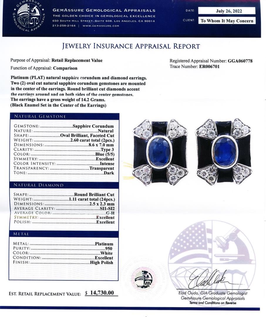 Platinum (PLAT) natural sapphire corundum and diamond earrings. Two (2) oval cut natural sapphire corundum gemstones are mounted in the center of the earrings. Round brilliant cut diamonds accent the earrings around and on both sides of the center gemstones. The earrings have a gross weight of 14.2 Grams. (Black Enamel Set in the Center of the Earrings) NATURAL GEMSTONE GEMSTONE: Sapphire Corundum NATURE: Natural SHAPE: Oval Brilliant, Faceted Cut WEIGHT: 2.60 carat total (2pcs.) DIMENSIONS: 8.6 x 7.0mm CLARITY: Type 3 COLOR: Blue (5/5) SYMMETRY: Excellent COLOR INTENSITY: Intense TRANSPARENCY: Transparent TONE: Dark NATURAL DIAMOND SHAPE: Round Brilliant Cut WEIGHT: 1.11 carat total (24pcs.) DIMENSIONS: 2.5 x 2.3mm AVERAGE CLARITY: SI1 to SI2 AVERAGE COLOR: G - H SYMMETRY: Excellent POLISH: Excellent METAL: METAL: Platinum PURITY: 950 COLOR: White CONDITION: Excellent FINISH: High Polish