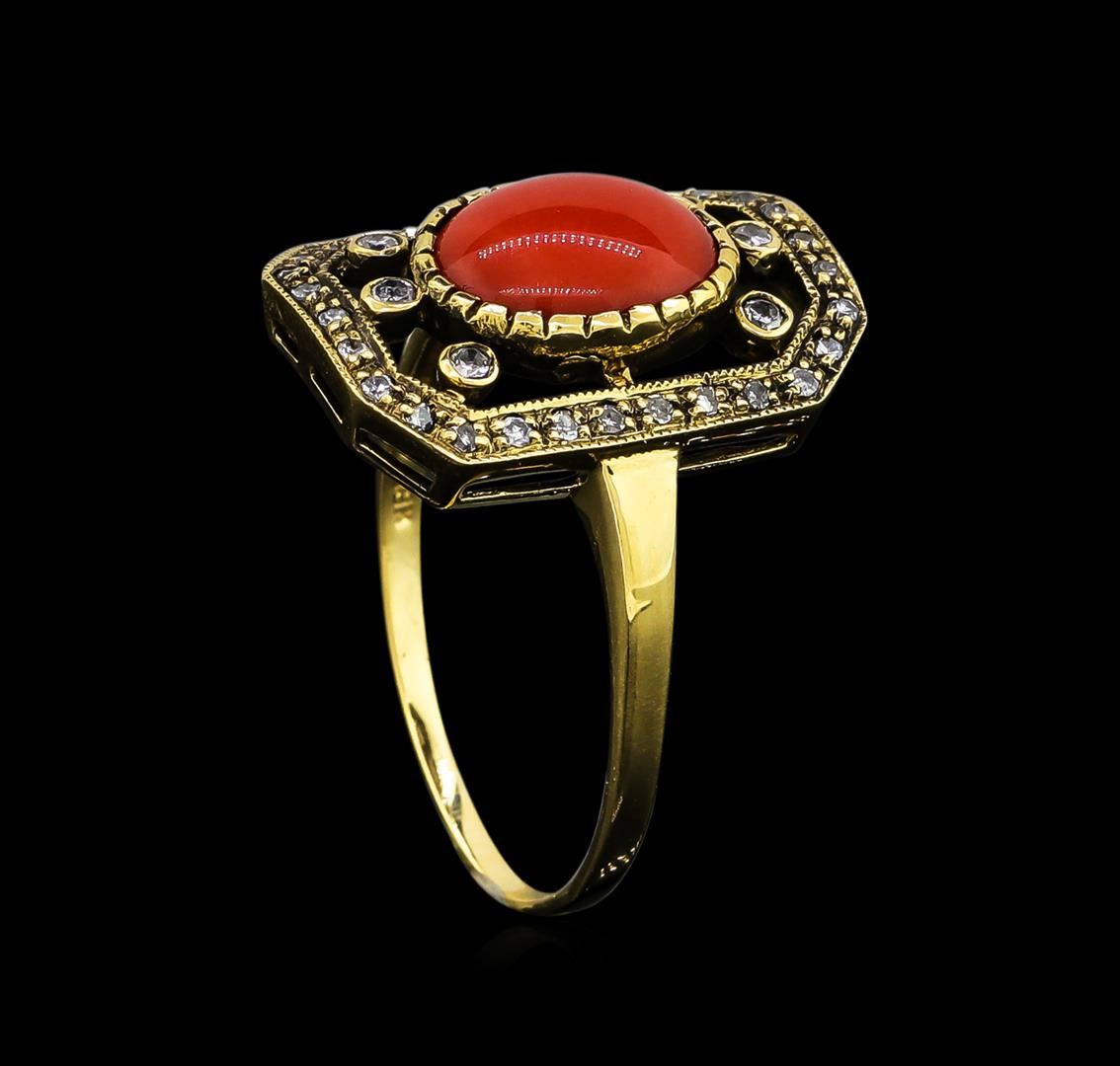 One ring featuring: 18KT yellow gold weighing 3.22 grams containing coral with a total weight of 2.60ct and diamonds with a total weight of 0.23ct.