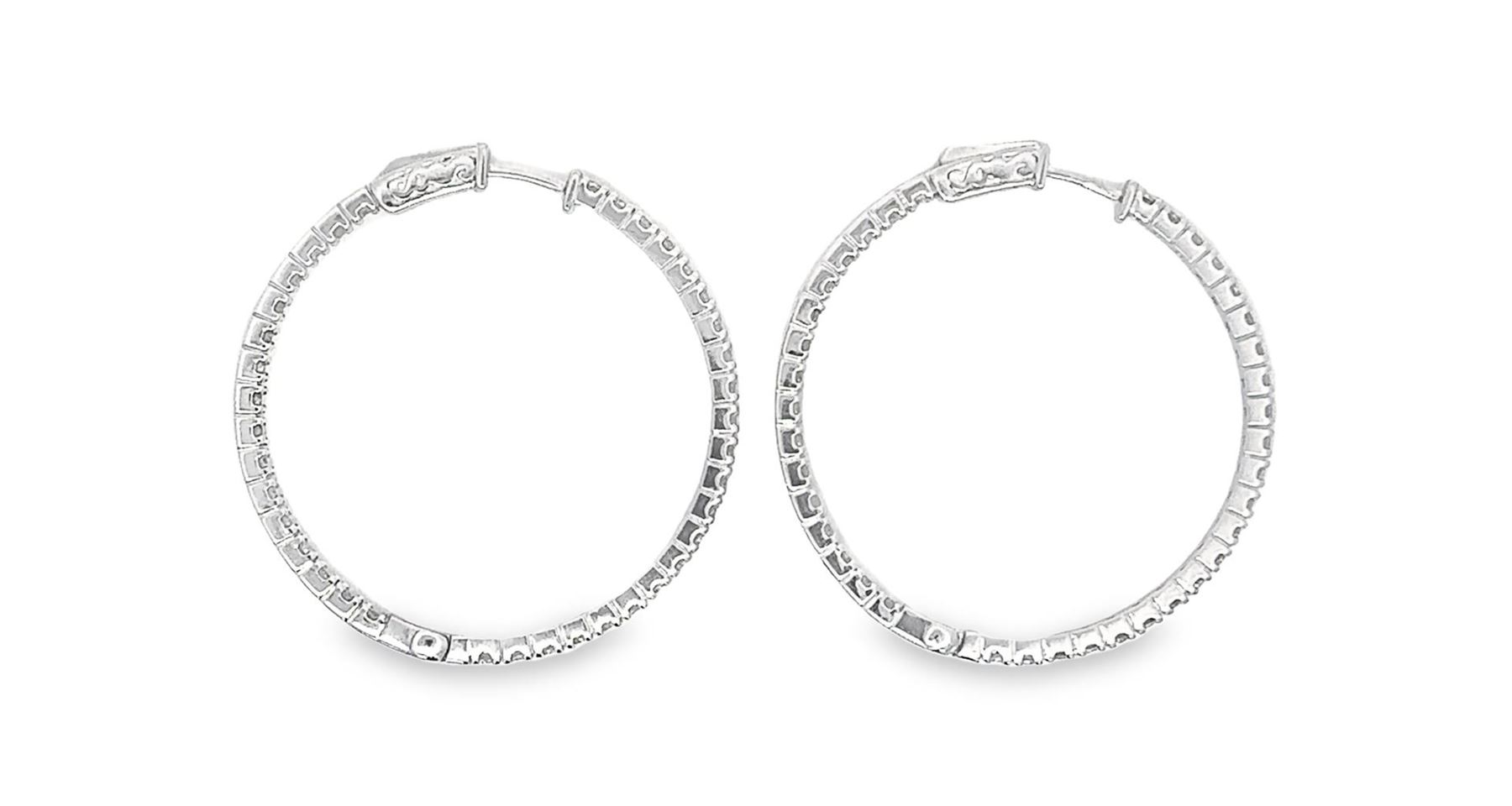 One pair electronically tested 14KT white gold lady's combination cast & assembled fashion inside-out hoop earrings with a bright polish finish. The featured hoop earring has a diameter of 38 millimeter. Identified with markings of "14K". Condition is new, good workmanship. Containing: Seventy-Six prong set round brilliant cut diamonds, measuring 2.10 - 2.00 x 1.32mm (depth est.) approximate total weight of 76 Stones = 2.60ct. Graded in the setting. Color I - J Clarity VS-2 to SI-1 Cut Very Good Total Weight of Diamonds 2.60ct. Total Weight of Earrings 9.40gm Estimated Retail Value $ 7750.00