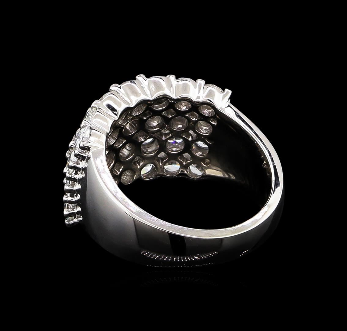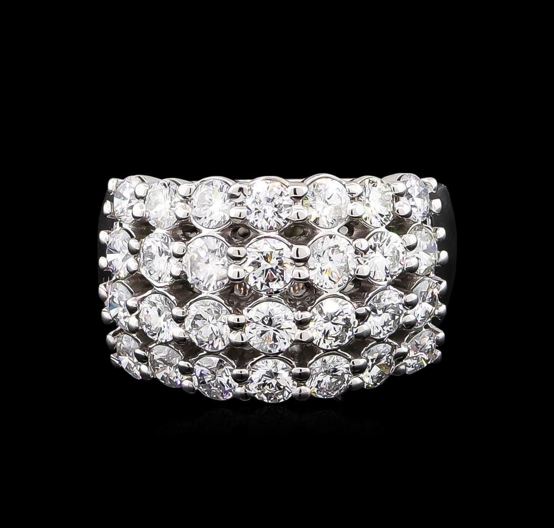 One electronically tested 14KT white gold lady's cast fashion ring with a wide band with a bright polish finish. The featured lady's ring has a diamond set four row motif and a shank measuring 4.12 millimeters wide. Identified with markings of "14K". Condition is new, good workmanship. Containing: Twelve prong set round brilliant cut diamonds, measuring 3.10 - 3.00 x 1.83mm (depth est.) approximate total weight of 12 Stones = 1.24ct. Graded in the setting. Clarity: SI-1 to SI-2. Color: H - I. Cut Good Sixteen prong set round brilliant cut diamonds, measuring 2.90 - 2.80 x 1.71mm (depth est.) approximate total weight of 16 Stones = 1.36ct. Graded in the setting. Clarity: SI-2 to I-1. Color: H - I. Cut Good. Total Weight of Diamonds 2.60ct. Total Weight of Ring 9.90gm. GAS Appraised at $7,720.00.