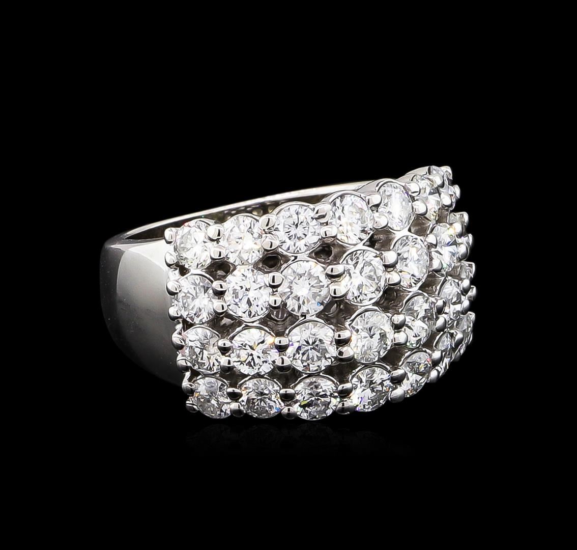 One electronically tested 14KT white gold lady's cast fashion ring with a wide band with a bright polish finish. The featured lady's ring has a diamond set four row motif and a shank measuring 4.12 millimeters wide. Identified with markings of "14K". Condition is new, good workmanship. Containing: Twelve prong set round brilliant cut diamonds, measuring 3.10 - 3.00 x 1.83mm (depth est.) approximate total weight of 12 Stones = 1.24ct. Graded in the setting. Clarity: SI-1 to SI-2. Color: H - I. Cut Good Sixteen prong set round brilliant cut diamonds, measuring 2.90 - 2.80 x 1.71mm (depth est.) approximate total weight of 16 Stones = 1.36ct. Graded in the setting. Clarity: SI-2 to I-1. Color: H - I. Cut Good. Total Weight of Diamonds 2.60ct. Total Weight of Ring 9.90gm. GAS Appraised at $7,720.00.