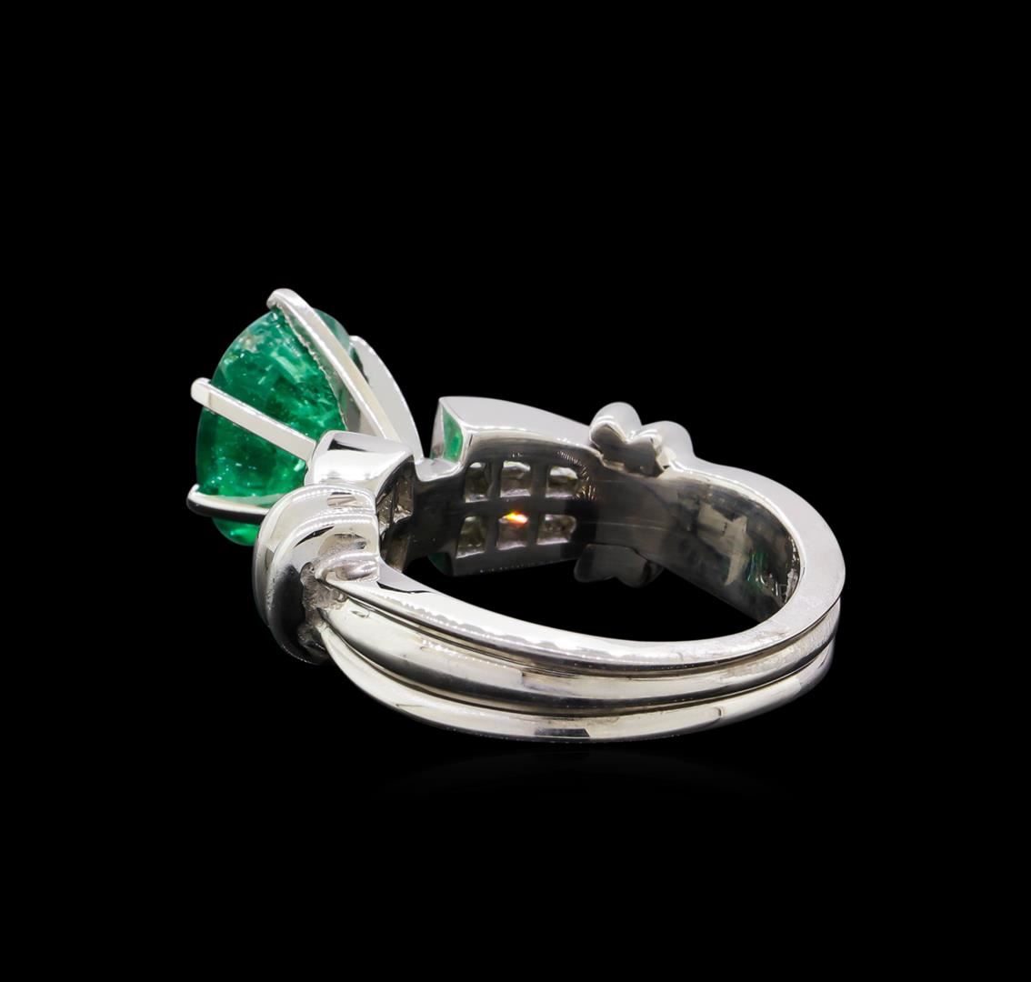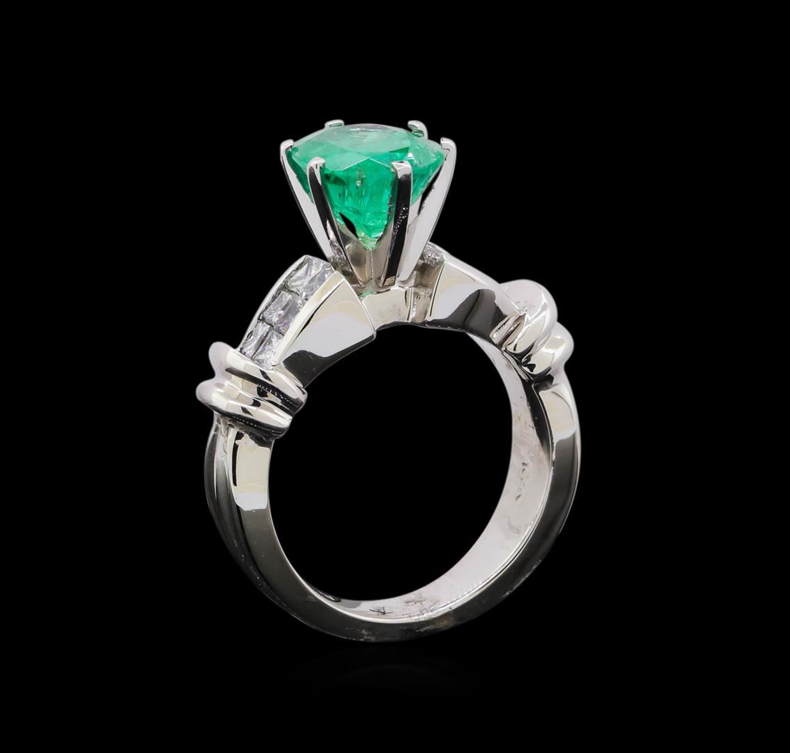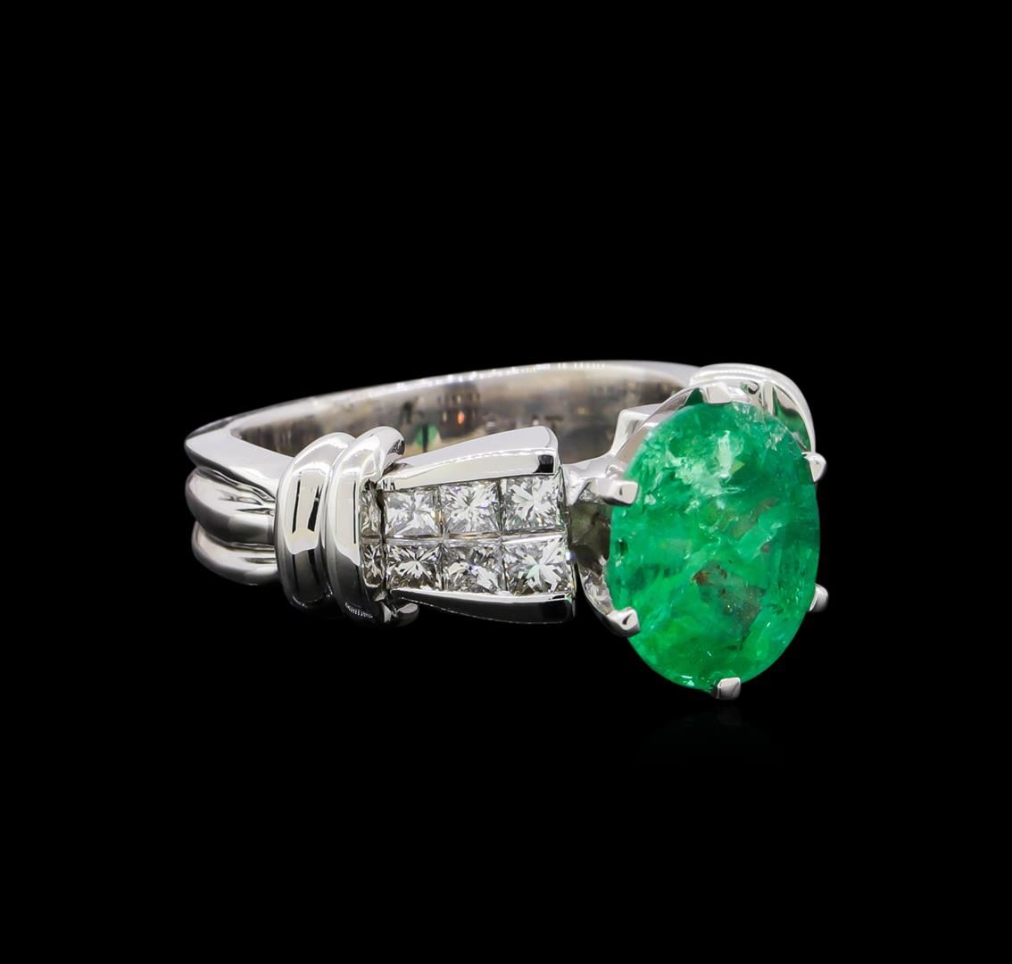 One platinum lady's ring weighing 9.98 grams containing one center oval cut emerald weighing 2.60ct and adjacent princess cut diamonds with SI clarity and G-H color weighing 0.85ctw