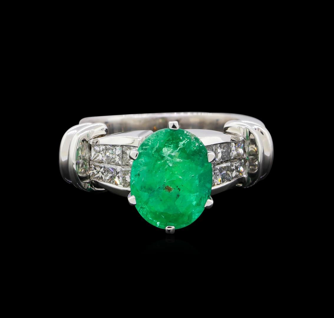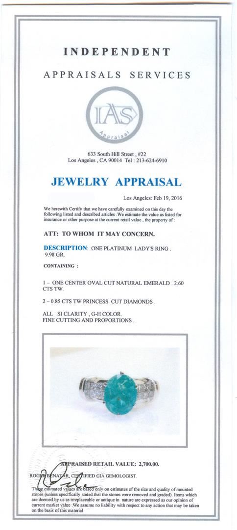One platinum lady's ring weighing 9.98 grams containing one center oval cut emerald weighing 2.60ct and adjacent princess cut diamonds with SI clarity and G-H color weighing 0.85ctw