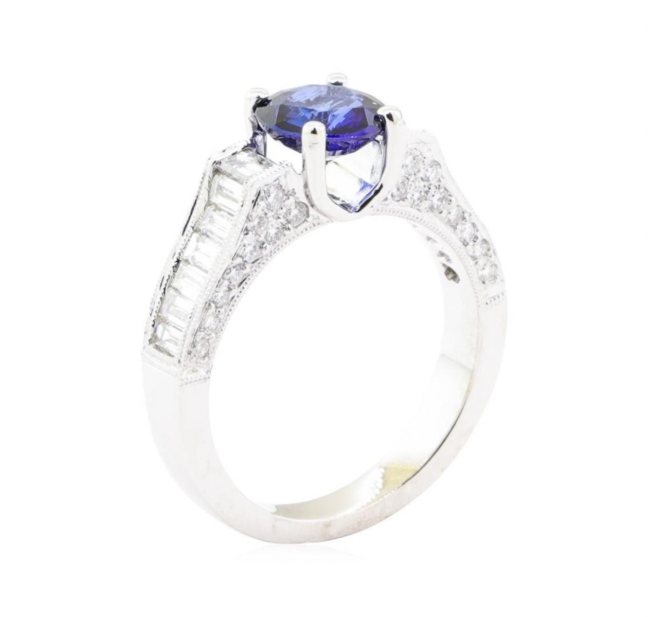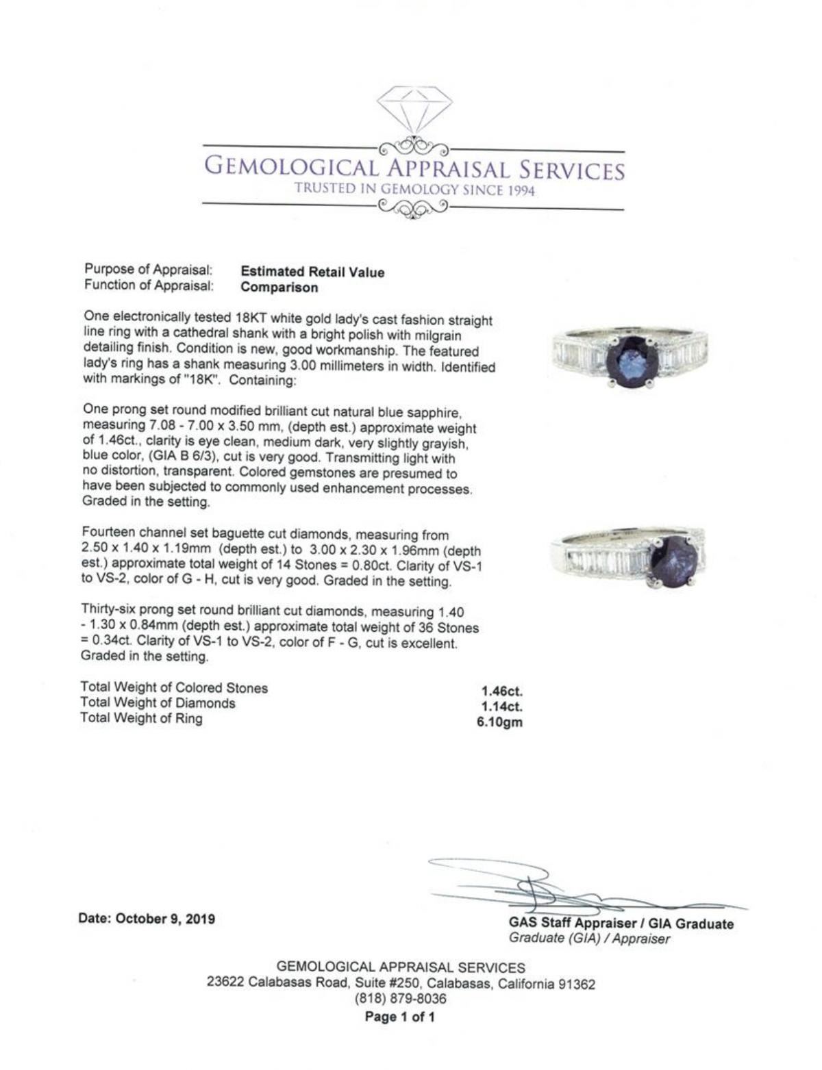 One electronically tested 18KT white gold lady's cast fashion straight line ring with a cathedral shank with a bright polish with milgrain detailing finish. The featured lady's ring has a shank measuring 3.00 millimeters in width. Identified with markings of '18K'. Condition is new, good workmanship. Containing: One prong set round modified brilliant cut natural blue sapphire, measuring 7.08 - 7.00 x 3.50 mm, (depth est.) approximate weight of 1.46ct., clarity is eye clean, medium dark, very slightly grayish, blue color, (GIA B 6/3), cut is very good. Transmitting light with no distortion, transparent. Colored gemstones are presumed to have been subjected to commonly used enhancement processes. Graded in the setting. Fourteen channel set baguette cut diamonds, measuring from 2.50 x 1.40 x 1.19mm (depth est.) to 3.00 x 2.30 x 1.96mm (depth est.) approximate total weight of 14 Stones = 0.80 ct. Graded in the setting. Color G - H Clarity VS-1 to VS-2 Cut Very Good Thirty-Six prong set round brilliant cut diamonds, measuring 1.40 - 1.30 x 0.84mm (depth est.) approximate total weight of 36 Stones = 0.34ct. Graded in the setting. Color F - G Clarity VS-1 to VS-2 Cut Excellent. Total Weight of Colored Stones 1.46ct.. Total Weight of Diamonds 1.14ct.. Total Weight of Ring 6.10gm GAS Appraised at $6480.00. GAS Appraised.