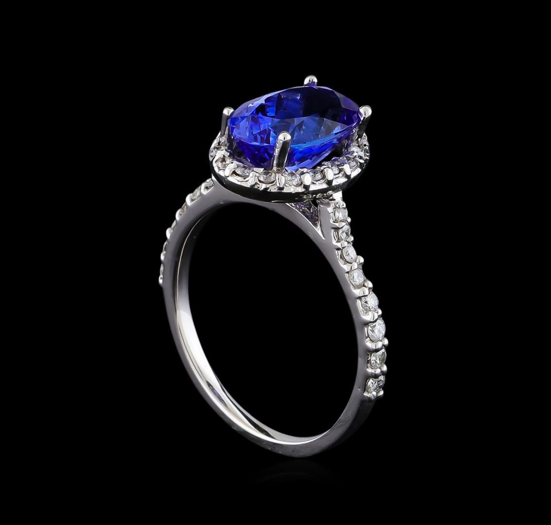 One electronically tested 14KT white gold lady's cast fashion ring with a halo with a bright polish finish. The featured lady's ring has a shank measuring 1.59 millimeters wide. Identified with markings of "K14". Condition is new, good workmanship. Containing: One prong set oval modified brilliant cut natural tanzanite, measuring 10.53 x 7.35 x 4.78mm, approximate weight of 2.60ct., clarity is eye clean, type I, medium dark, strong, violetish blue color, (GIA vB 6/5), cut is very good. Transmitting light with no distortion, transparent. Colored gemstones are presumed to have been subjected to commonly used enhancement processes. Graded in the setting. Ten prong set round brilliant cut diamonds, measuring 1.70 - 1.60 x 1.02mm (depth est.) approximate total weight of 10 Stones = 0.18ct. Graded in the setting. Clarity: SI-1 to SI-2. Color: H - I. Cut Good Twenty-Four prong set round brilliant cut diamonds, measuring 1.40 - 1.35 x 0.86mm (depth est.) approximate total weight of 24 Stones = 0.24ct. Graded in the setting. Clarity: SI-1 to I-1. Color: H - I. Cut Good. Total Weight of Colored Stones 2.60ct. Total Weight of Diamonds 0.42ct. Total Weight of Ring 3.80gm GAS Appraised at $5,775.00.
